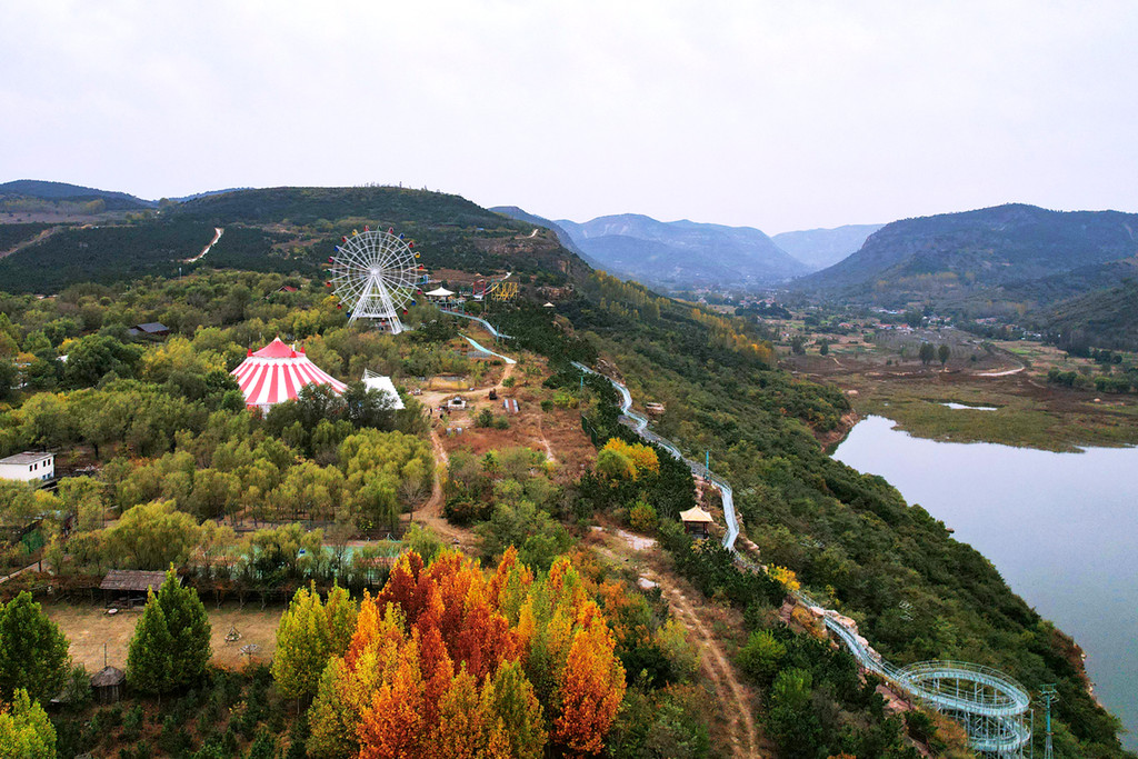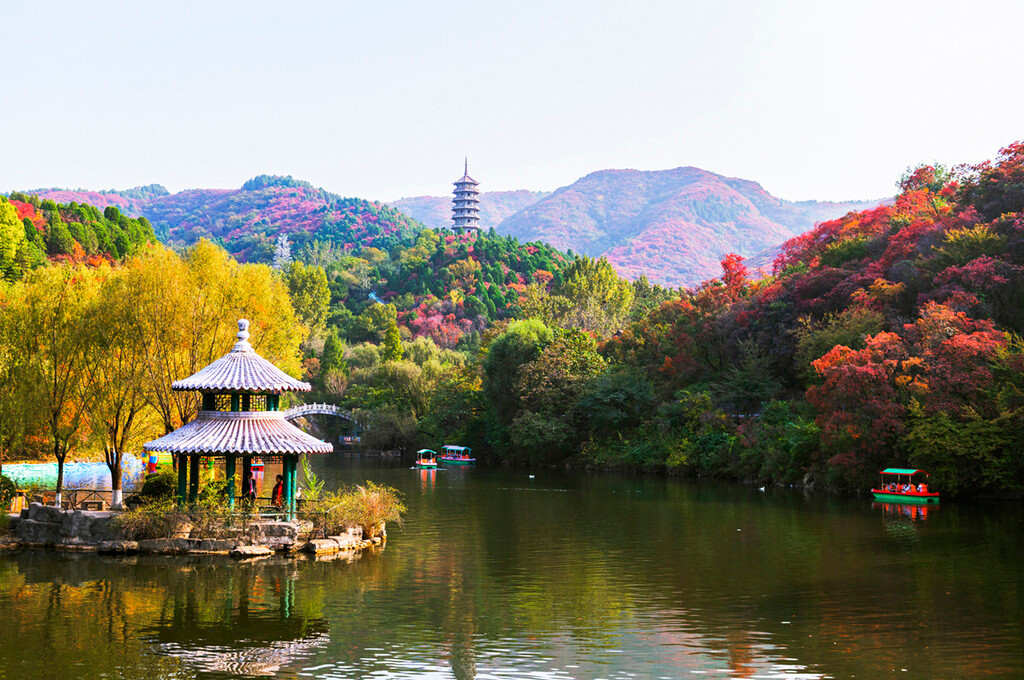 绚秋湖是红叶谷的另一地标,也是景区有别于万叶塔的另一个绝佳观景点。远处的山,近处的树,塔与湖,湖与水,水与船,船与人,相映成趣。在这里可以乘船游湖,也可以在湖边喂喂锦鲤,白鹅之类。