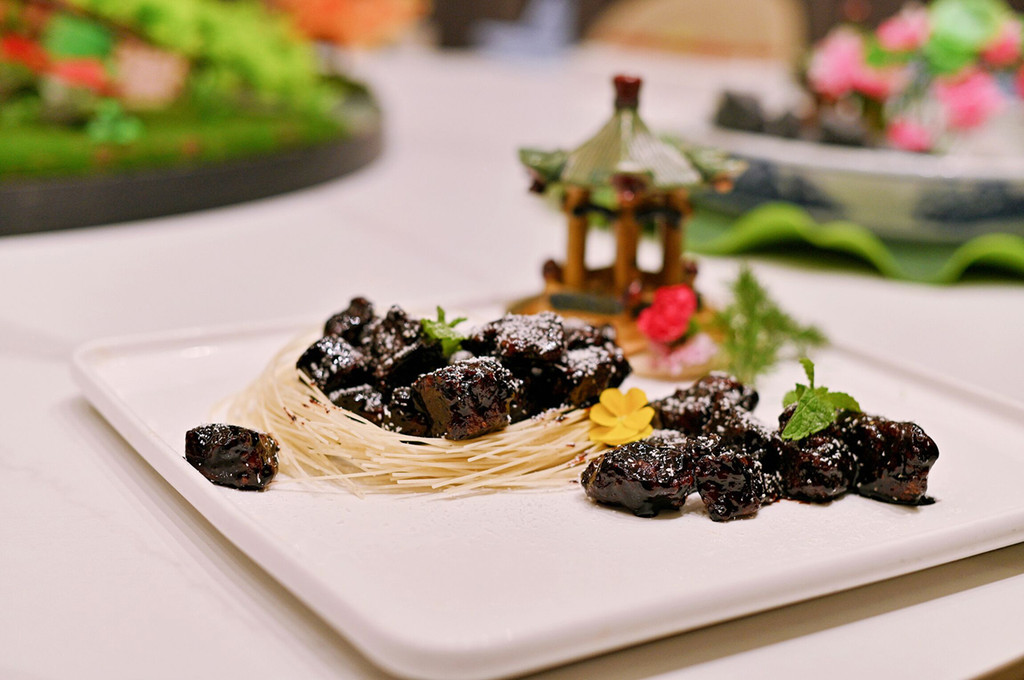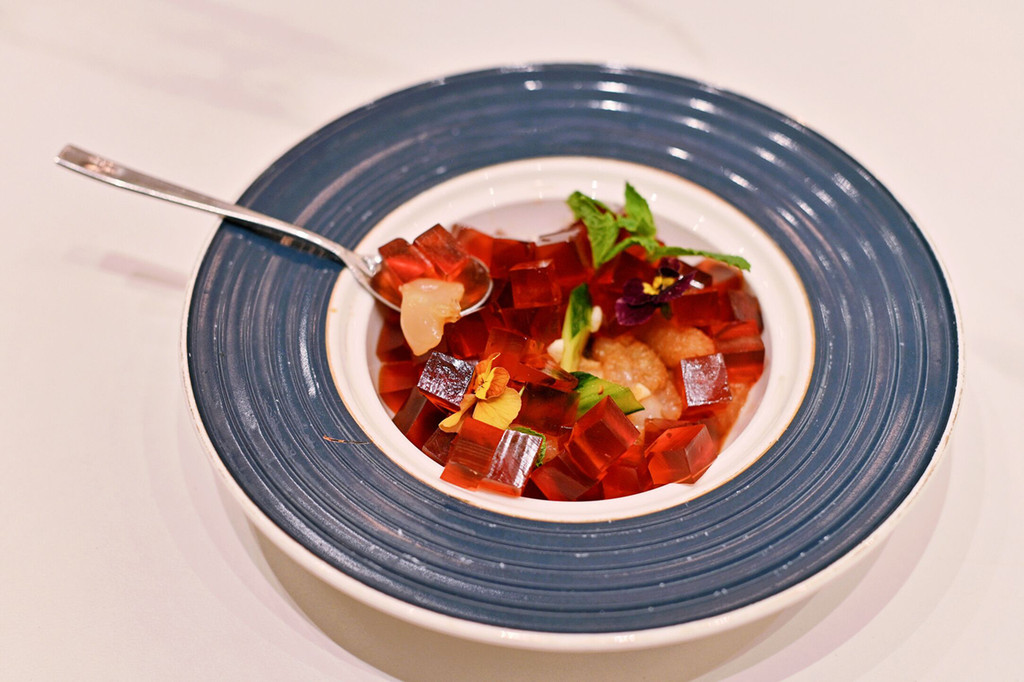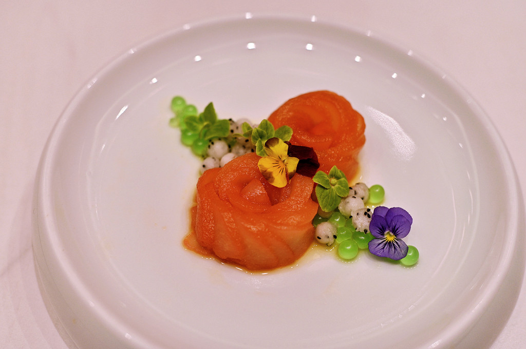 开餐前,所有人都差点被这碟凉菜给唬住,它真的不是三文鱼刺身吗?真的不是!这是道红酒雪梨。被红酒浸透的雪梨,一片片围成玫瑰的形状,点缀上细小的火龙果粒,Q弹的水果珠,颜值100分。入口既有雪梨的清甜,又有红酒的甘醇,口感冰冰凉凉,酸甜可口,浓郁的红酒味道和水果的甘甜美妙地融为一体,沁人心脾。