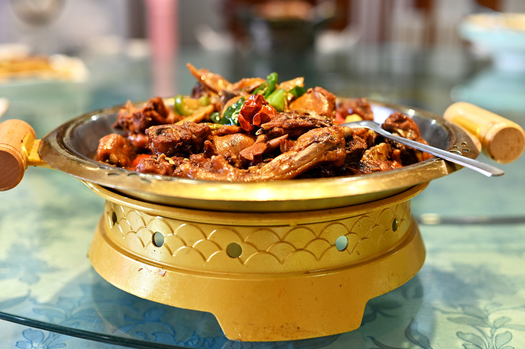 我们去的是临沂高伟炒鸡总店。他家的鸡炒的是香麻味儿,不同于川渝麻辣的热烈,这边是点到为止的椒麻味儿,辣也辣的不冲口。鸡肉炒得比较有嚼劲,越嚼越香的那种。口味方面,算略微偏咸,其汤汁是精华,用来沾饼,或是配米饭都非常出彩。