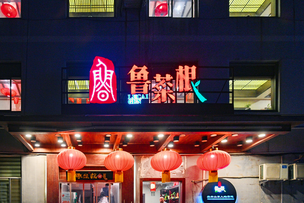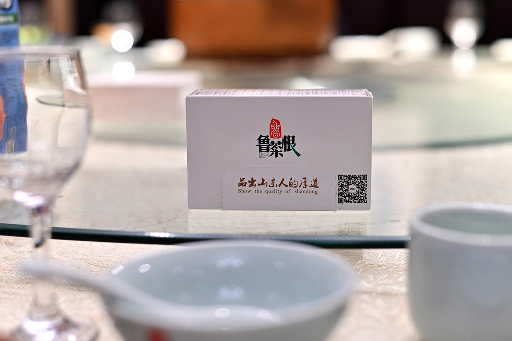 晚餐去吃泰安最有名的的鲁菜馆之一:鲁菜根。它家主打就是当地特色菜,也是连锁店那种,东西南北都有。店家的灯箱&纸巾上写着一句话:品出山东人的厚道!特豪迈!