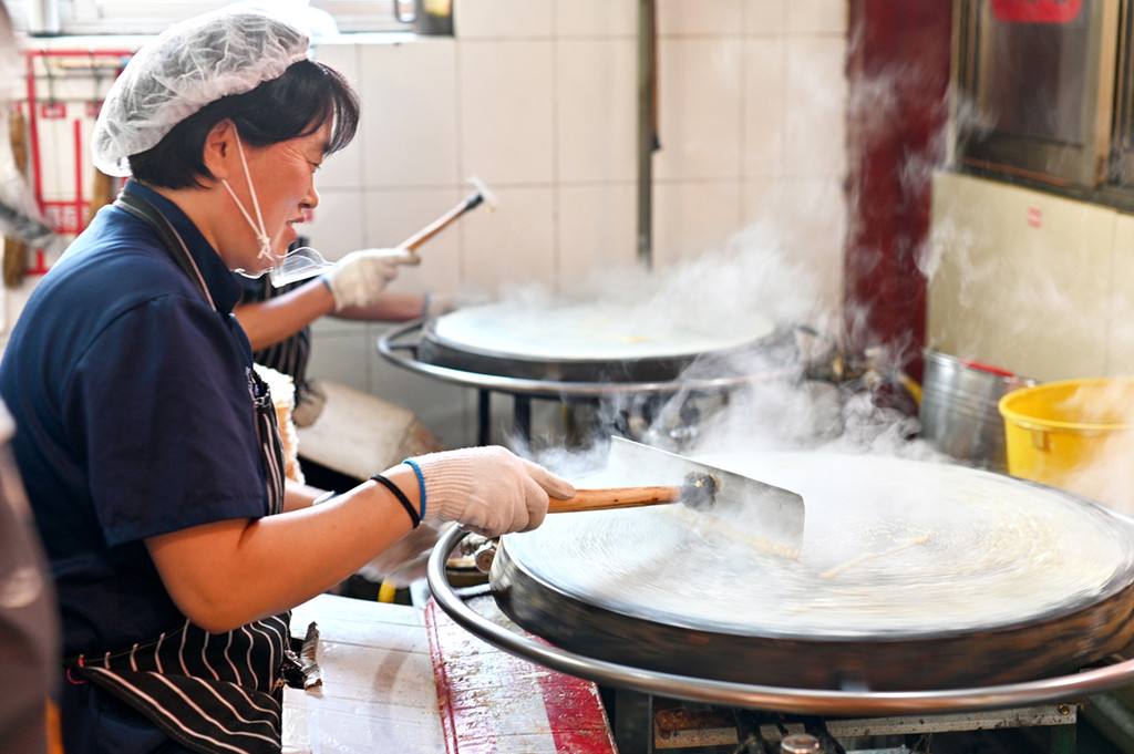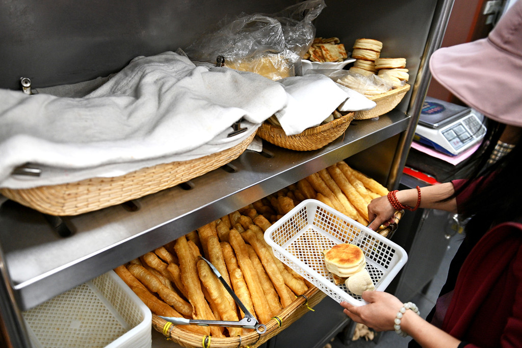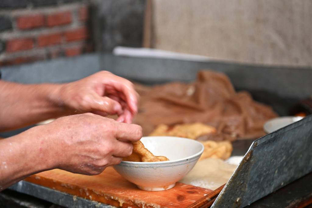 这家店在济南按察司街的中段,周边有学校,所以早高峰可以说是非常之早。为了避免街道堵车,也为了避免油条摊排长队,我们清晨六点出头就到了,然而,小小的摊子边早已坐满了食客。当地的朋友说,这可是济南排了30年大队的早点摊啊。