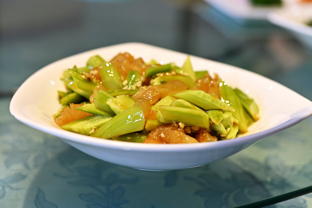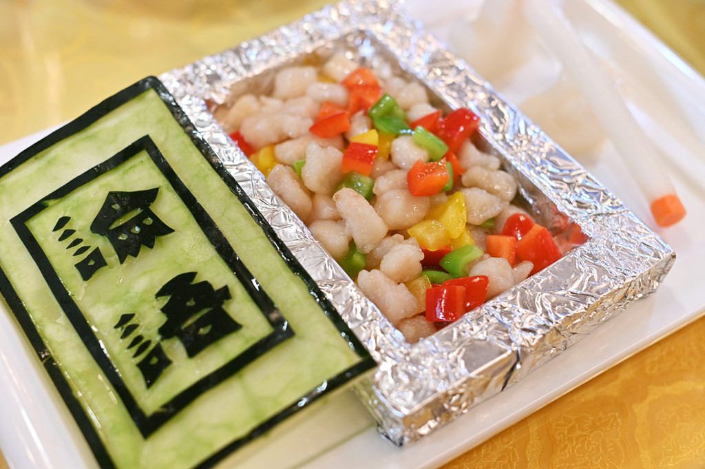圣书香的书,是论语,封面用冬瓜雕刻而成,书里的内容是彩椒鳕鱼丁,嫩、滑、爽、清淡,入口沁心,有书的外形,亦有其内涵。