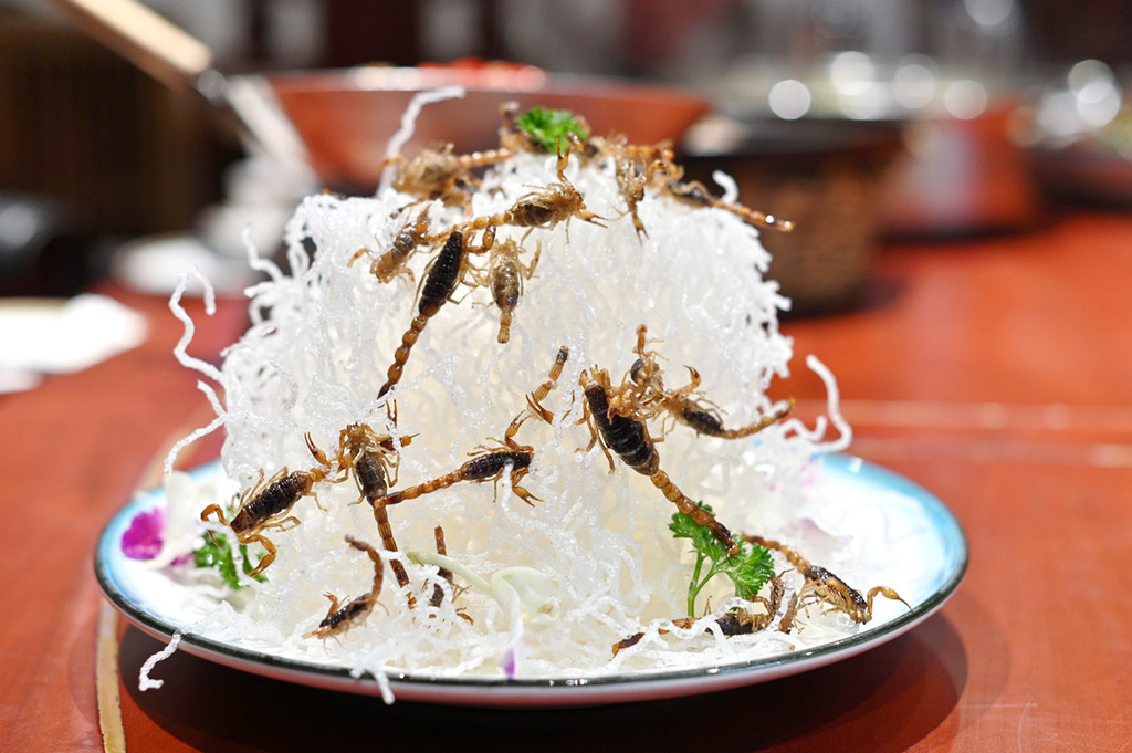 菜品方面,最震惊的是一道炸蝎子,山东名吃,沂蒙特产。这边的气候和环境条件适宜于全蝎的生长,当地蝎子资源丰富,不仅产量高,还是典型的个大膘肥。炸熟的蝎子一只只趴在奶白的米线条上,看着挻吓人的,但吃起来,嘎嘣脆,而且越嚼越香。