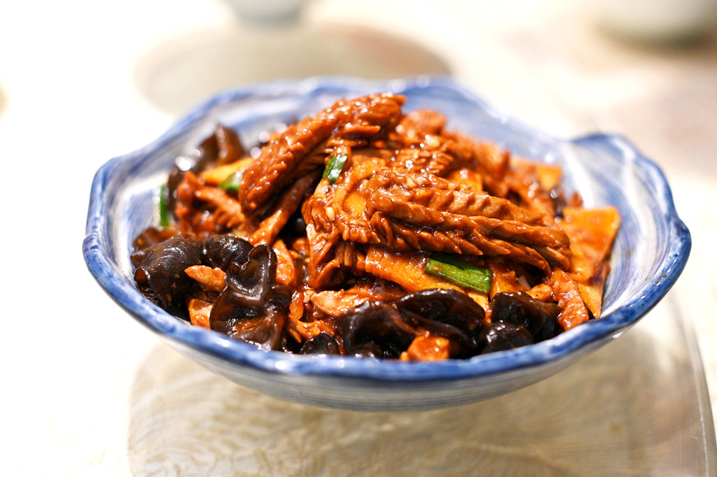 泰山有三美,白菜豆腐水。这个孔门豆腐,也是招牌特色。看起来是经过薰蒸的豆腐,有别于家常普通豆腐的寡淡,味道浓烈,略有点带酸口。