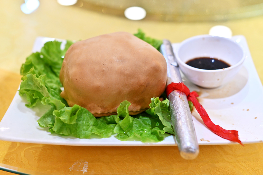 祯祥肘子上桌时乍一眼看上去像是一团面疙瘩,请同桌尊者用楮轻敲,待剥开外壳,才见里面的鲜红大肘子,仪式感也是很足的。