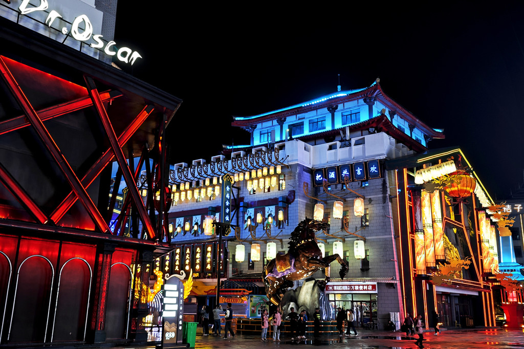 熠熠的灯光与街道上古老的建筑,还有各种特色店铺装潢交相辉映。街道两侧的店铺,张扬又独特。
