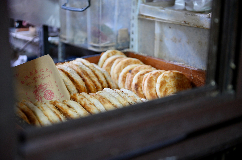 旁边的小巷还有家小小的“秦记火烧”,门脸极不起眼,但这店子在当地却极为有名,白天常期排大队的那种。它家火烧外圈焦香,内里软而有韧劲,味道极好,价格也很便宜,油酥的1.5元/个,椒盐2元/个,金锣的5元/个,而且是一个基本能管饱的那种类型。