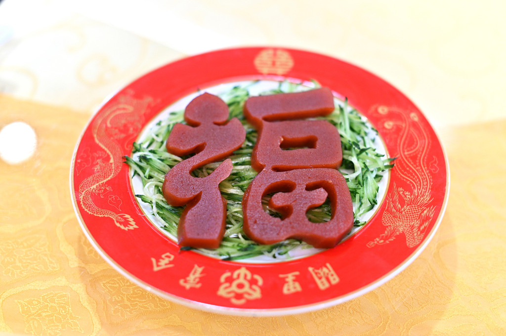 看到都会心生欢喜的福字看盘,大大的福字是整块的山楂糕。掰一块“福气”入品,酸甜Q弹,口感细腻,山楂的酸和糖的甜相互融合,口感层次丰富。