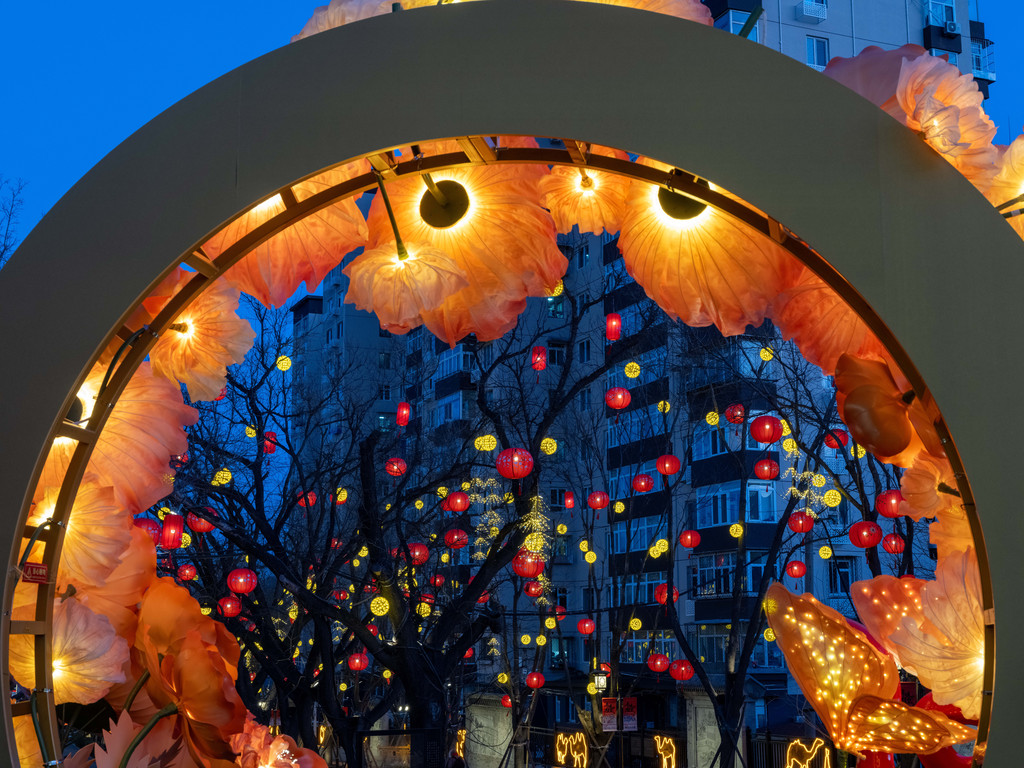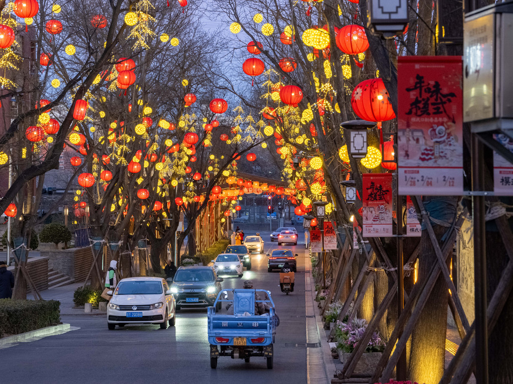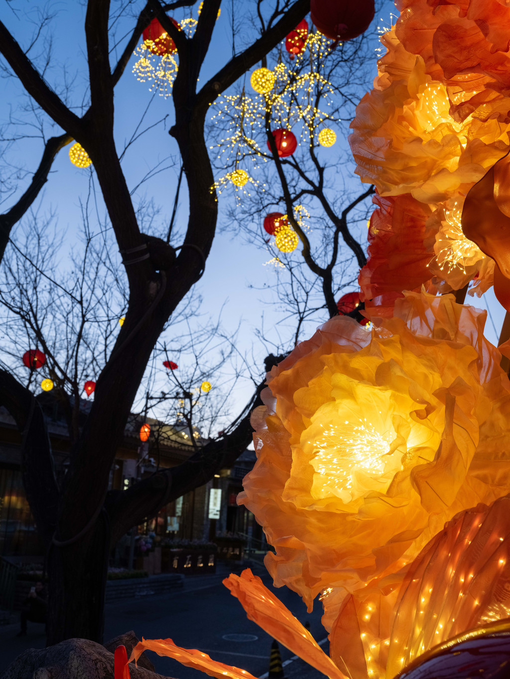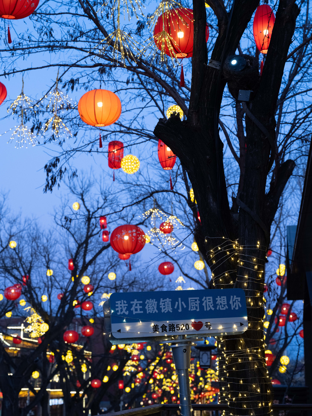 在京西书局对面的徽镇小厨,从他们家门口可以东向拍模式口入口的花灯,也可以向西拍模式口大街。因为天冷,当天很多人都在小厨和书局的附近拍照。