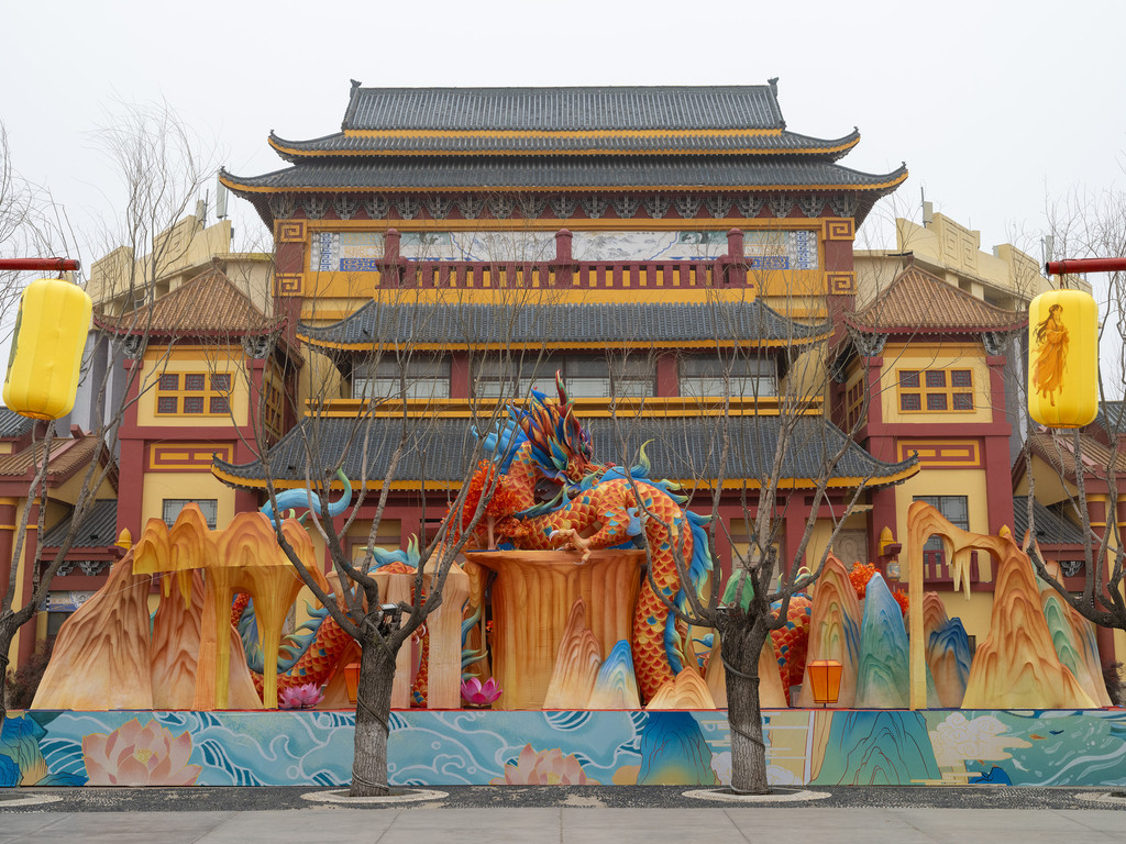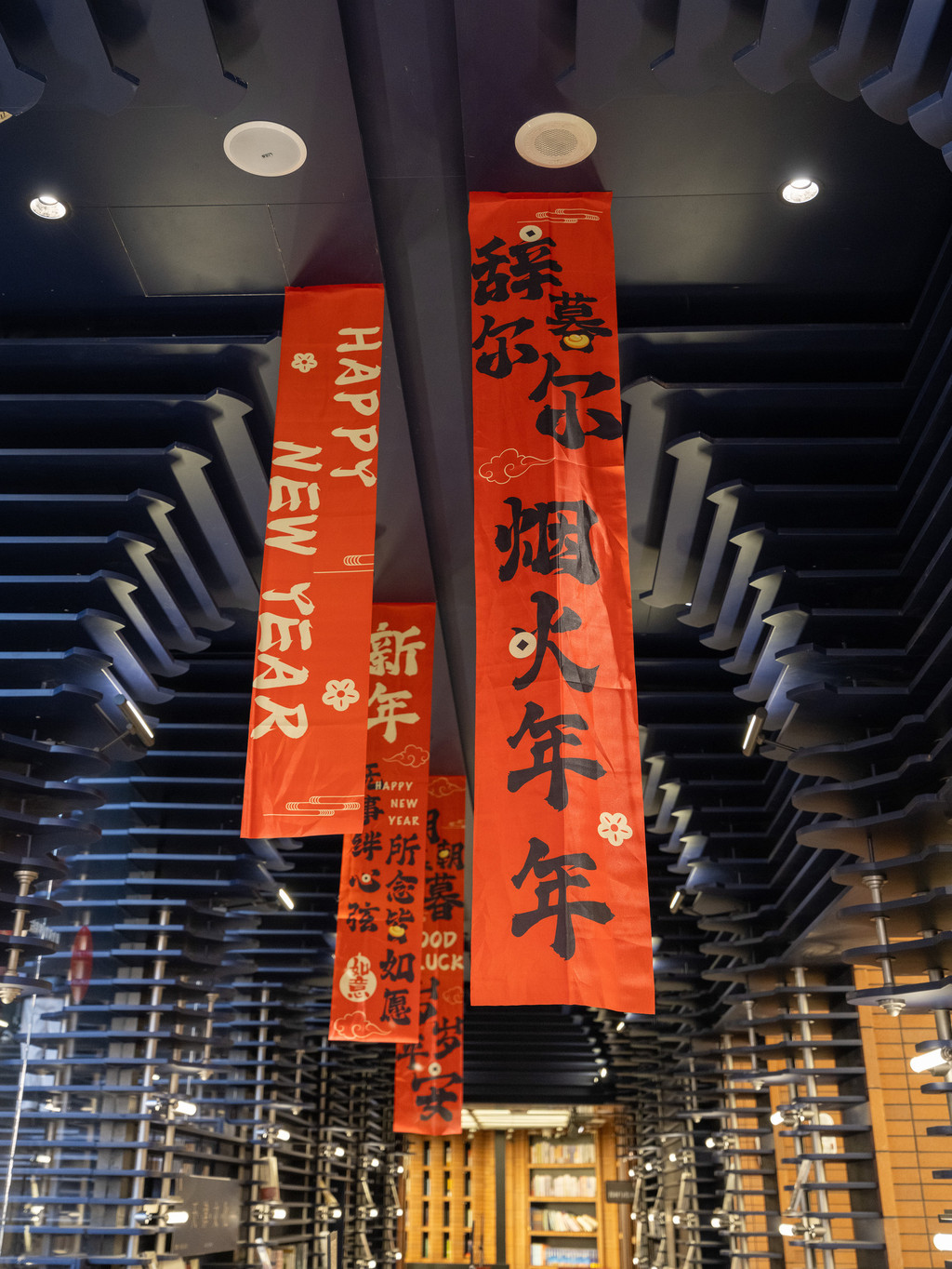气氛到位,一进门帅哥美女一起给你拜年,情绪价值拉满;园区红色主题有年味