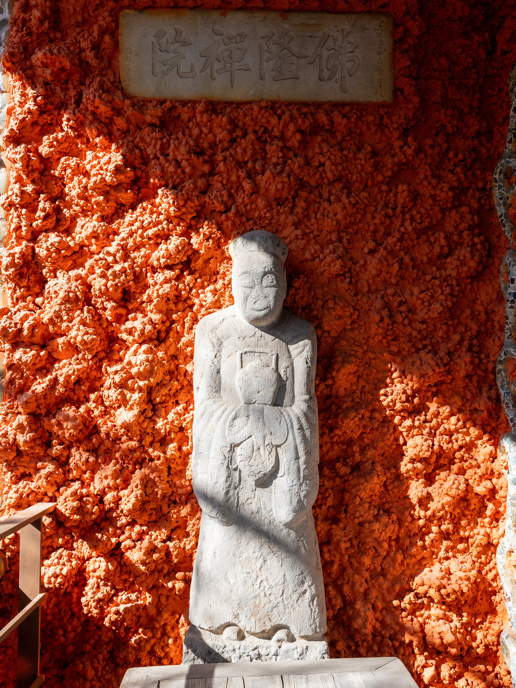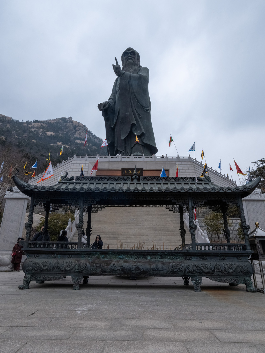 矗立于太清宫后山的老子铜像,系根据唐代画圣吴道子所画的老子像制作而成。这座铜像由339块青铜壁板拼装焊接而成,高达50米,总用铜约150吨,共耗时4年于2016年建成,是世界上最大的老子铜像,现已成为崂山南线旅游的全新标志景观。