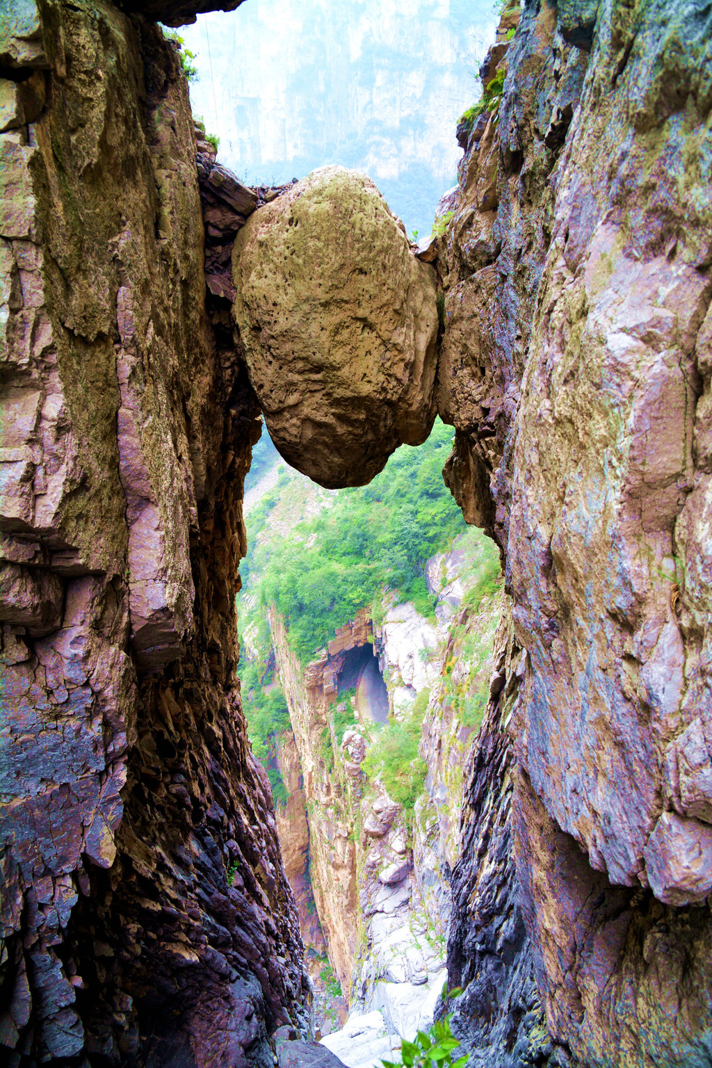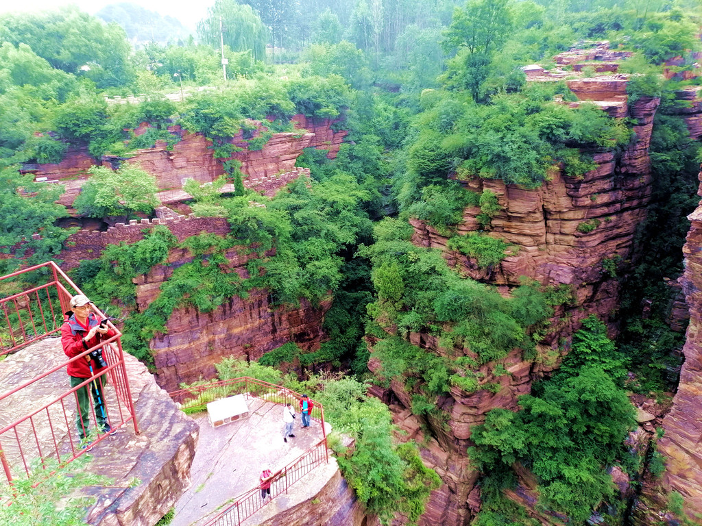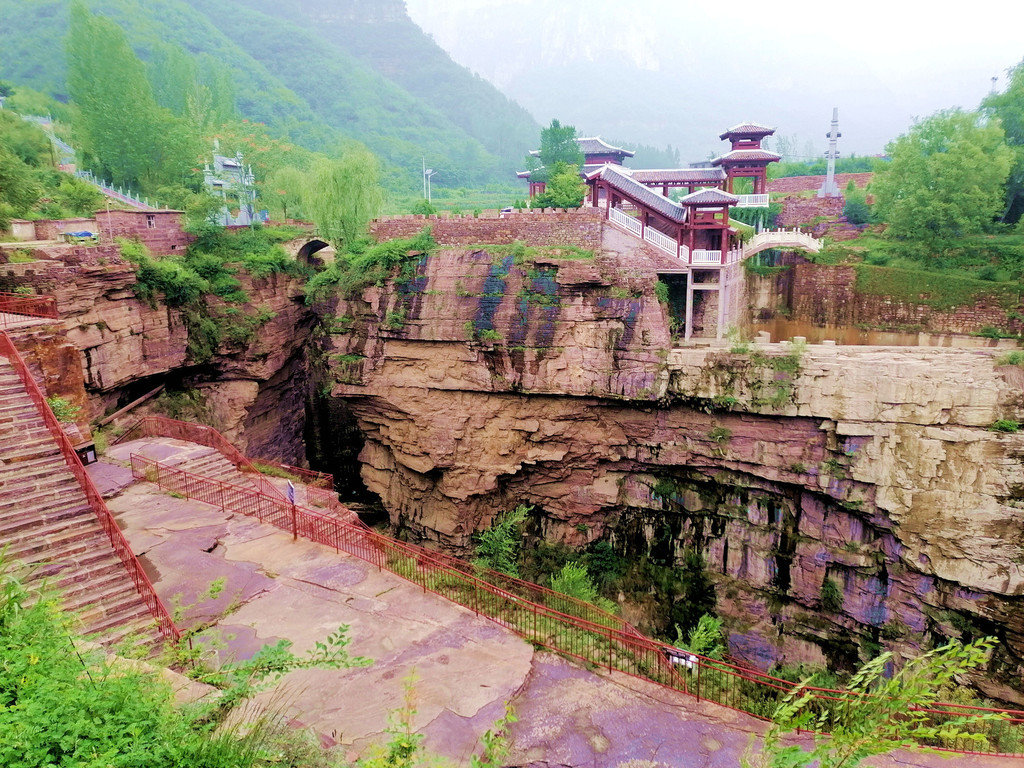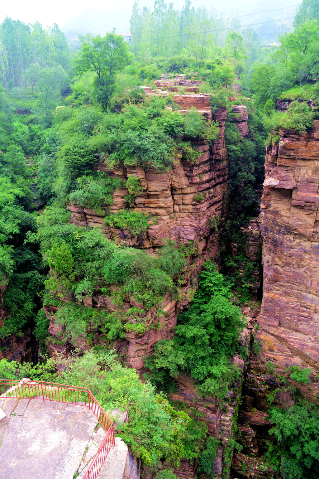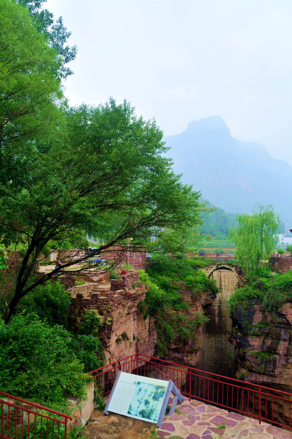 沟内居民或依山傍水,或临崖跨涧,错落聚散,隐现有致。村内建筑多用石材,石屋、石桥、石径、石桌、石碾、粗放古朴,"野味"浓郁。"天坑型"的地形环境,使得这里的小气侯温和,水量丰沛,植被茂密,湖光山色,小桥流水,如至江南。村中一条大峡谷,由北向南伸展,如天坑之地缝,深处可达200几十米,震旦纪红砂岩壁东西对应,曲折排列,窄处几米,宽处200多米,如一条苍凉的时空隧道,无尽延伸,湮没于河南境内。