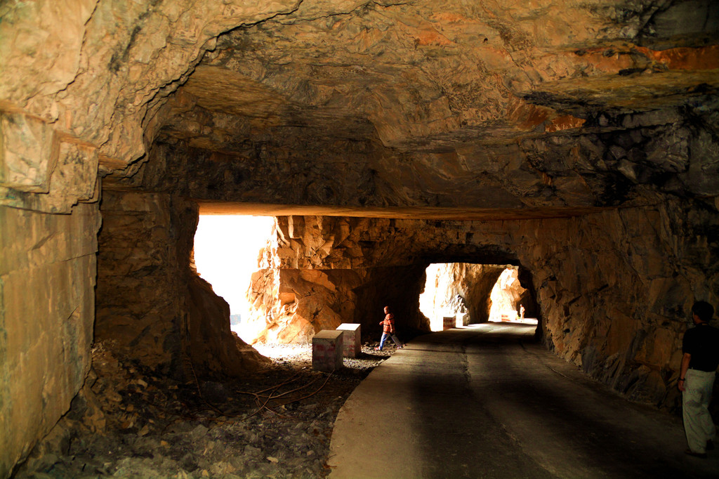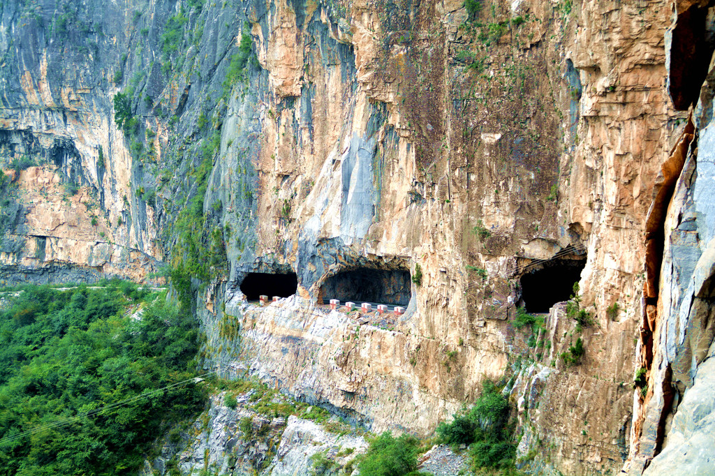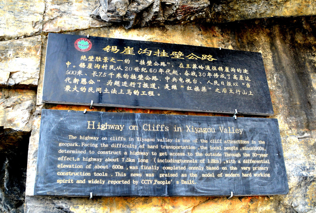 锡崖沟挂壁公路是有3层,像一个之字。从山顶上下来有2个拐弯,而且坡度比较陡,走在公路上面好像有人推着行走。中国目前有7条比较有名的挂壁公路,锡崖沟是第一条,无论长度,难度,观赏度,都是最好的。而且也是花了30多年,从1962年开工,1992年完工。中国最早的挂壁公路。后来的郭亮用锡崖沟的经验,改用炸药爆破。用了5年时间,开凿了1250米的挂壁公路。其难度和长度,远远地不及锡崖沟。