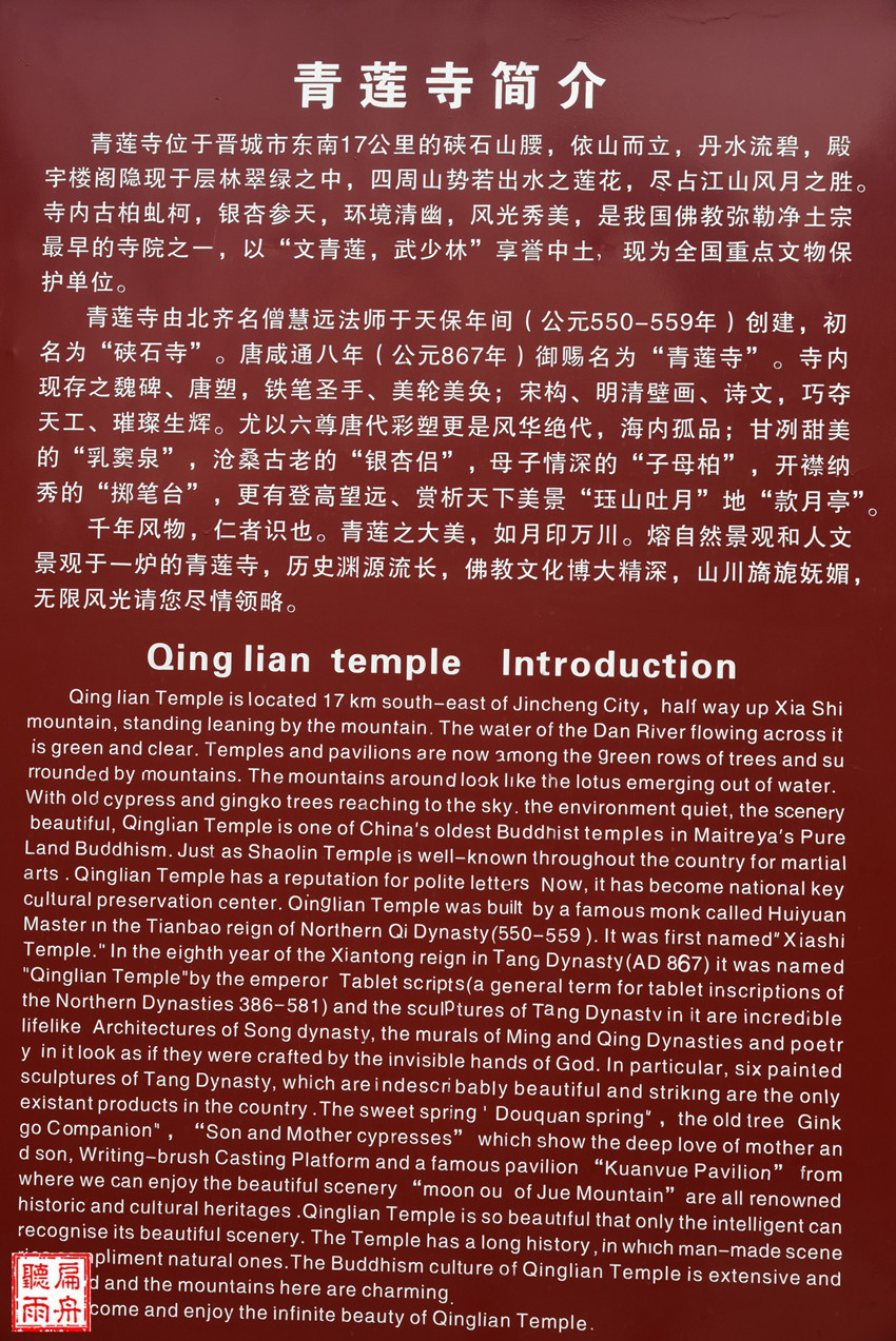 建于北齐天保年间(公元550-559年)的青莲寺,坐北朝南,面依丹河,背靠硖石山,初命硖石寺。唐太和二年(828年),重修硖石寺,并在硖石寺上方偏东的山腰上扩建寺院。从此,硖石寺有了两处寺院,一座下寺,一座上寺。上寺正殿里的释迦佛祖端坐于莲花宝座之上,咸通八年(867年),当朝皇帝为寺院敕赐“青莲”为额,硖石寺始称青莲寺。