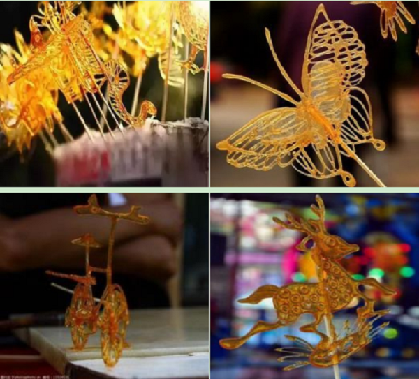 造型生动、色彩鲜艳,随着缕缕糖稀在艺人手下飘洒,栩栩如生的飞禽走兽、花鸟虫鱼等形象便呈现在大家面前,用竹签粘起来,等待凝固后对着光凝望,显得晶莹剔透、活灵活现。