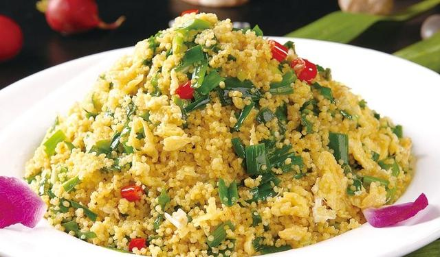 颗颗米粒松散可分,互相不粘不黏,原滋原味的粗粮炒饭,黄金诱人的外观,养胃健康且低脂低油,可谓养生佳肴。