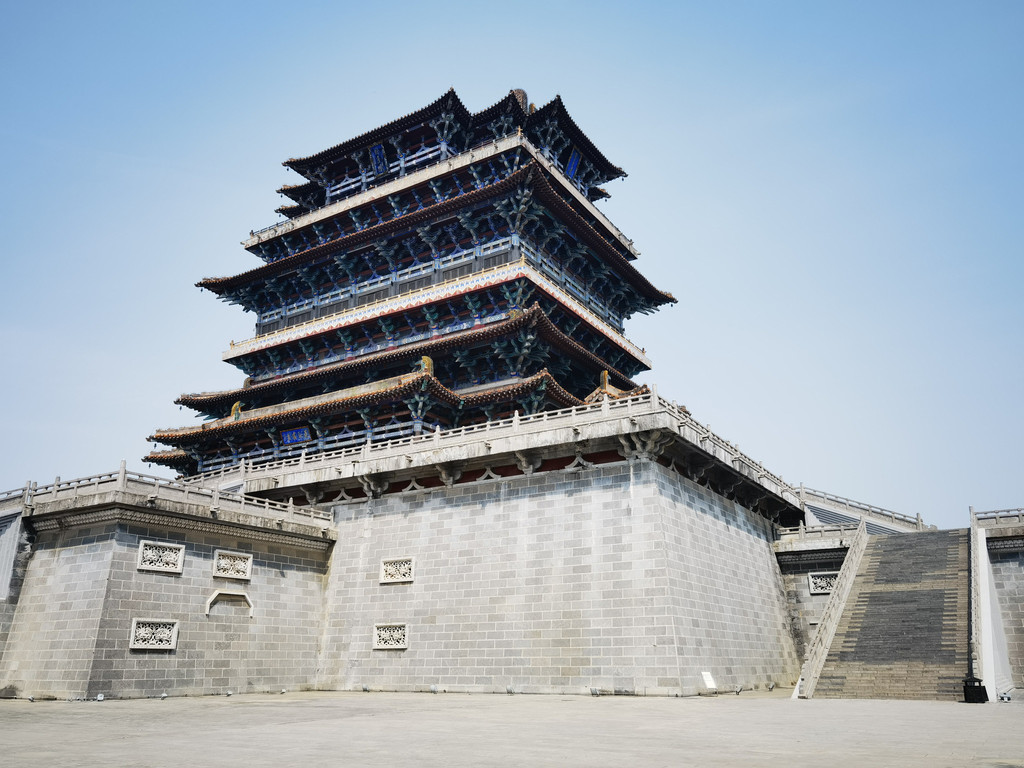 鹳雀楼为高台式十字歇山顶楼阁,整座楼阁分为台基和楼身两部分,总高度达73.9米,是四大名楼中最高的一座,也是中国仿造楼中较为精致的。