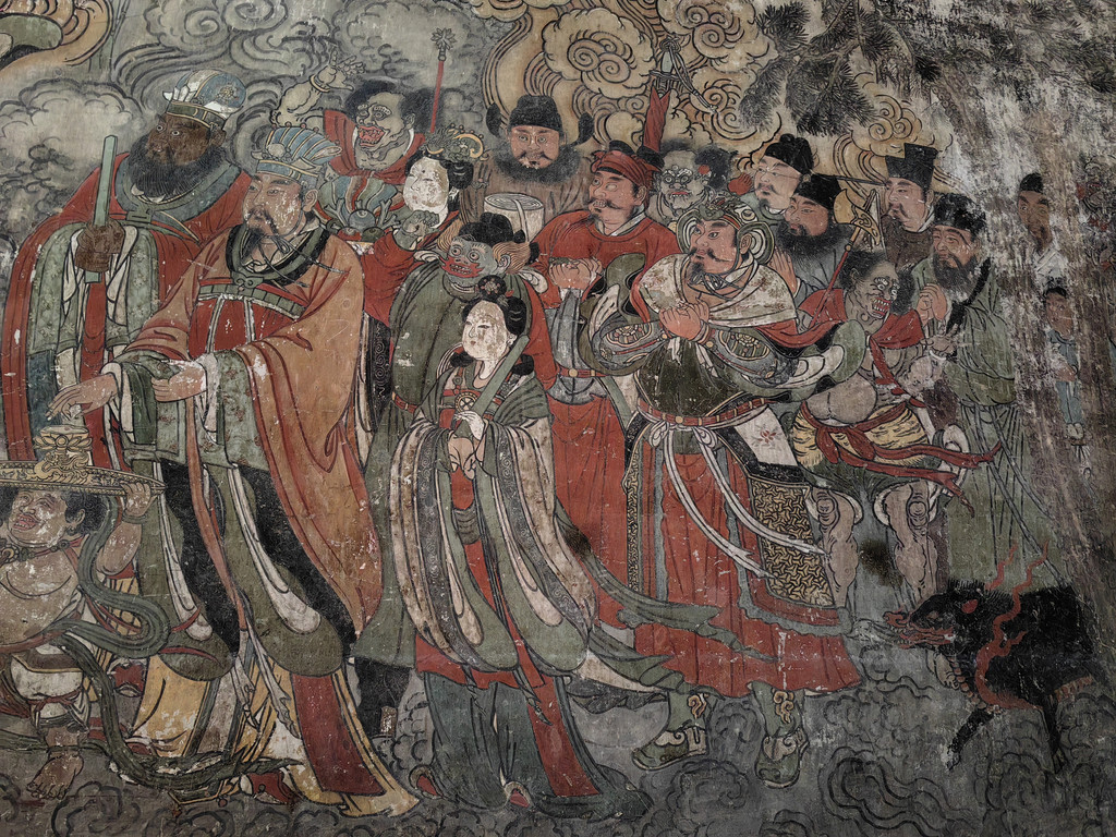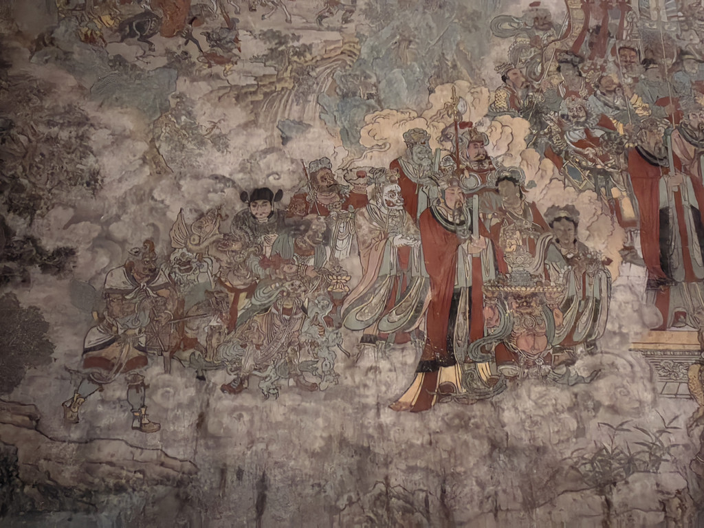 水神庙为元代遗构,明应王殿为水神庙主体建筑,殿内现存元代壁画保存完整,分布在四壁。相较于永乐宫壁画,水神庙壁画更具生活气息。亭台楼阁、宫廷市井、天上人间、人文生活交相呼应,包括了社会、经济、文化、民俗、建筑、娱乐等各个方面,展现出了一幅完整的元代生活图景。