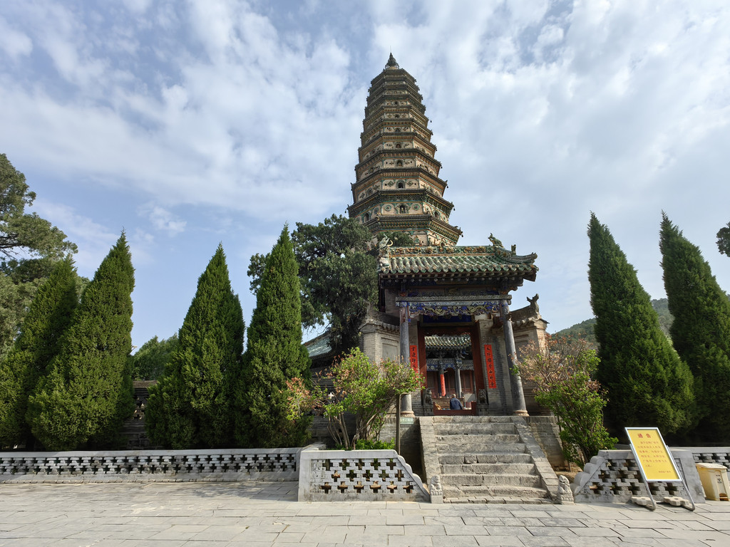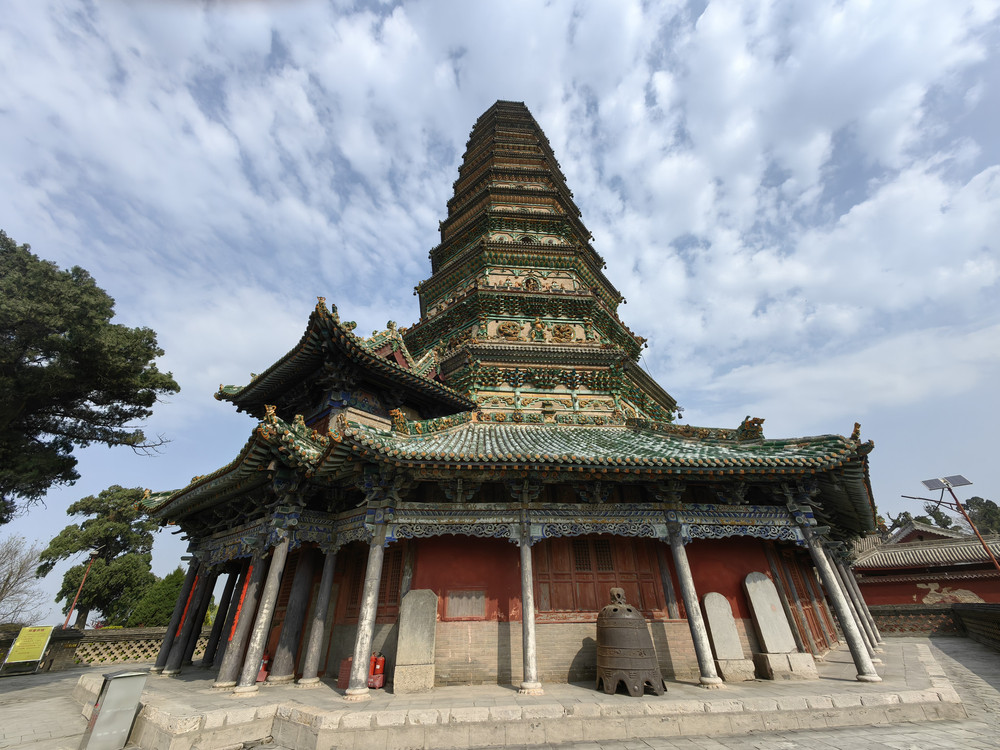 进入广胜寺寺门,奇伟精致的琉璃塔巍然屹立,高耸入云。这座塔始建于汉,屡经重修,塔身用青砖砌成,共13层,每层均为八角形。从底到顶,各层高度逐渐递减,而宽度也逐层收缩,构成一个漂亮的圆锥体。
