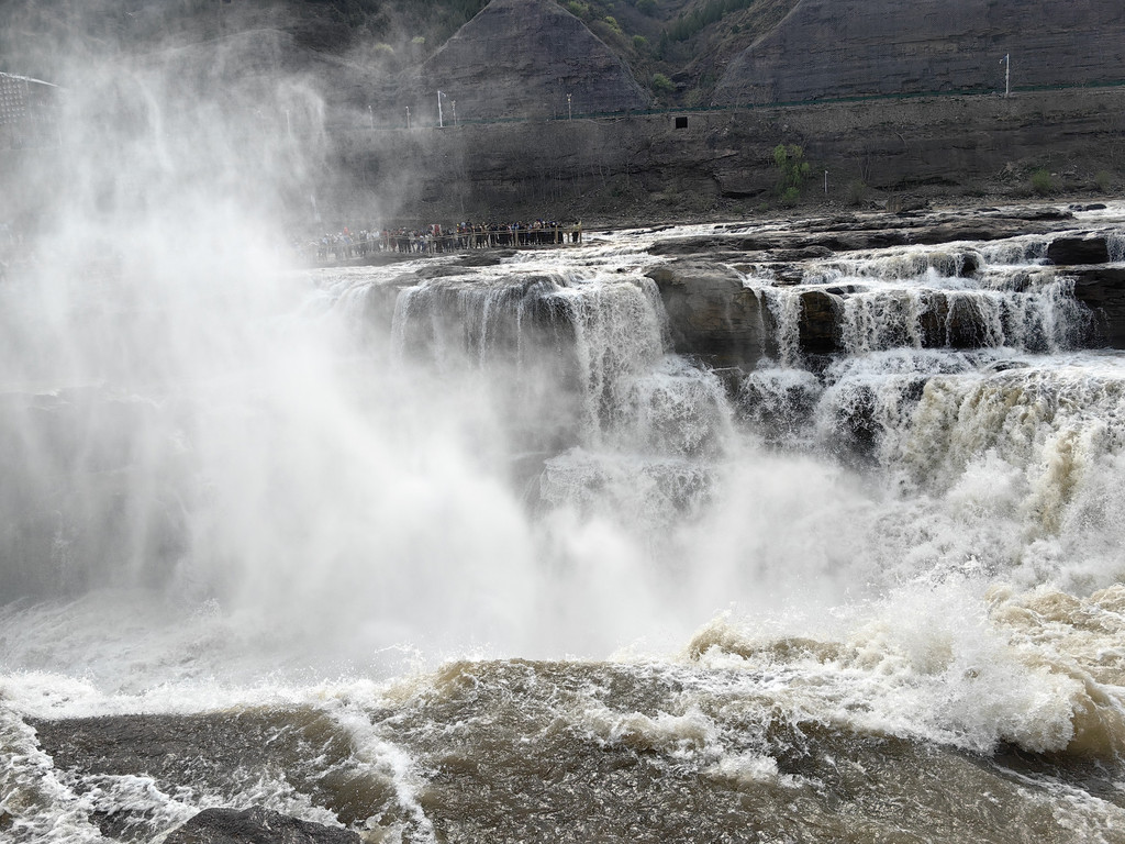 壶口瀑布东濒山西省临汾市吉县壶口镇,西临陕西省延安市宜川县壶口乡,号称“黄河奇观”,是世界上唯一的金黄色瀑布,也是中国的第二大瀑布。壶口两岸高山对峙,奔腾的黄河水经过壶口,滔滔黄河到此被两岸苍山挟持,束缚在狭窄的石谷中,600米余宽的洪流骤然收束为30余米,从20余米高的断层石崖飞泻直下,跌入30余米宽的石槽之中,听之如万马奔腾,山鸣谷应,视之如巨龙鼓浪,波浪翻滚,惊涛怒吼,震声数里,其形如巨壶沸腾,故名壶口瀑布。以壶口瀑布为中心的风景区,集黄河峡谷、黄土高原、古塬村寨为一体,展现了黄河流域壮美的自然景观和丰富多彩的历史文化积淀。