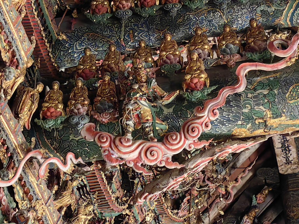 寺内分上、下两院,以明代的彩色悬塑艺术而闻名,其精华保存于大雄宝殿。殿内满布大型彩绘悬塑,除佛坛上的五尊主佛外,墙壁、檩柱、屋椽上都塑着数以千计的彩塑。这些彩塑色泽明丽、造型生动、姿态各异,多而不乱、繁而不杂、高者达3米多,小者仅有拇指大小,人物造型丰满、生动,内心世界刻画动人。全堂彩塑是我国少见的彩塑艺术群塑,填补了中国佛教彩塑艺术史上的空白,堪称是中国悬塑艺术博物馆,具有不可估量的历史和艺术价值。