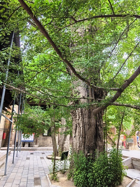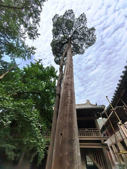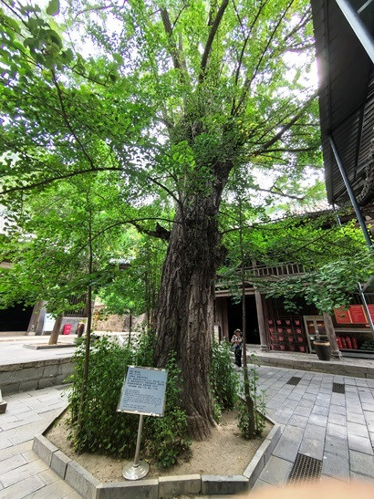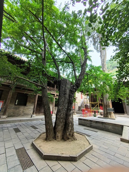 大雄宝殿前有两个奇特景观,一是子抱母古柏,二是千年雄雌银杏树。