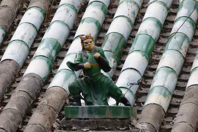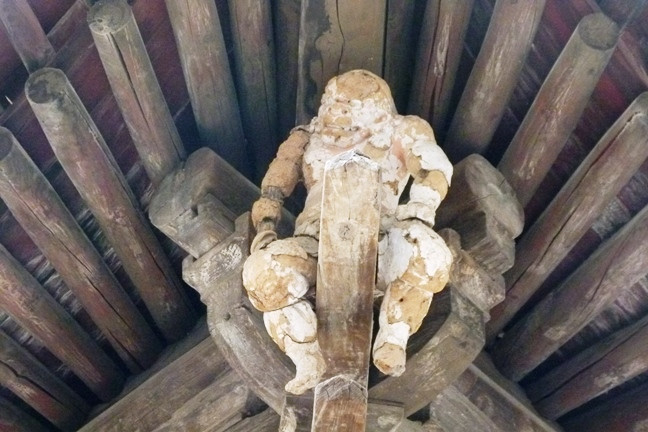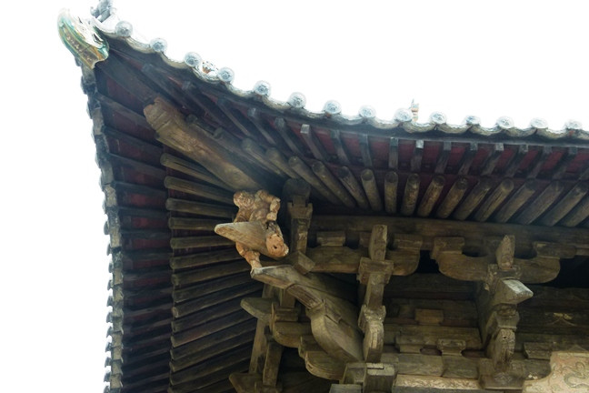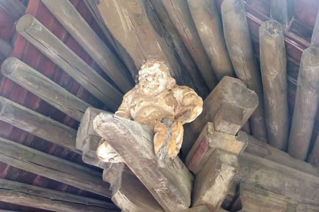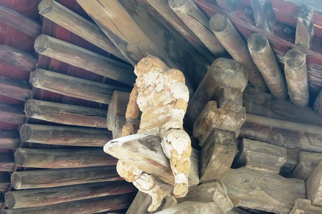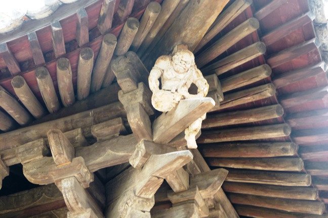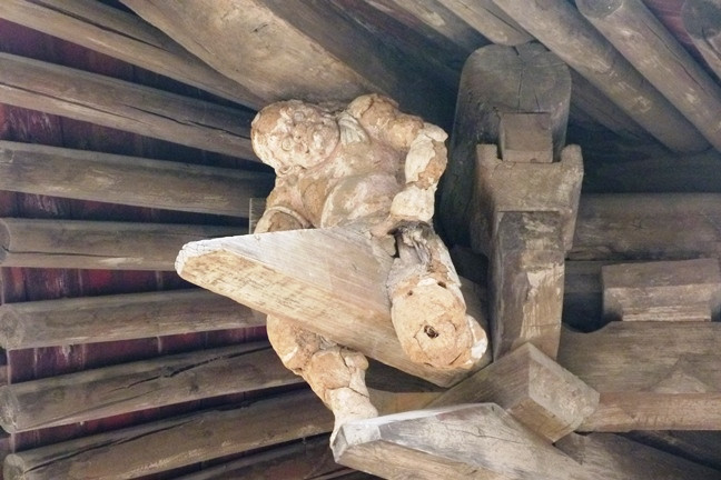 藏经阁四个转角的斗栱处,均有一个体型健硕、面部略带狰狞,但憨态可掬的小力士,费劲卖力地扛着房梁。古建上这种在转角用以承托角梁梁腹的木构件被形象地称为“角神”。角神常以肌肉饱满、动态十足的力士造型出现。藏经阁四处檐角的角神俱保存完好,实属罕见。藏经阁的角神是中国现存古建中不多的实例。