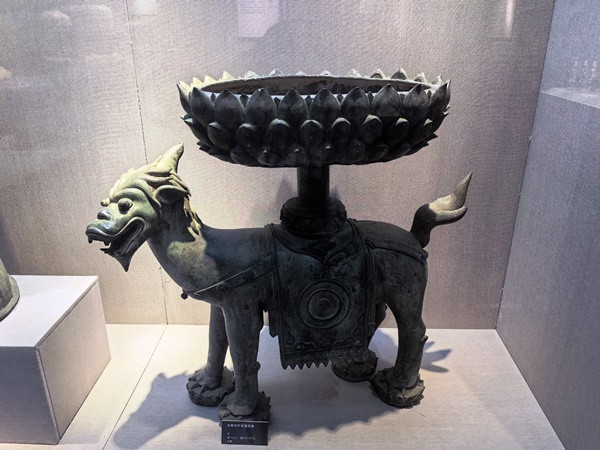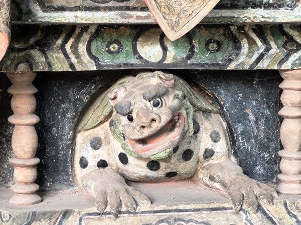 文殊菩萨和普贤菩萨所坐莲台的须弥座下的瑞兽,普贤菩萨的坐骑白象,文殊菩萨的坐骑狮子(有时为麒麟)。但这个狮子有点怪异,身上的斑点像蟾蜍。