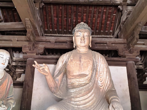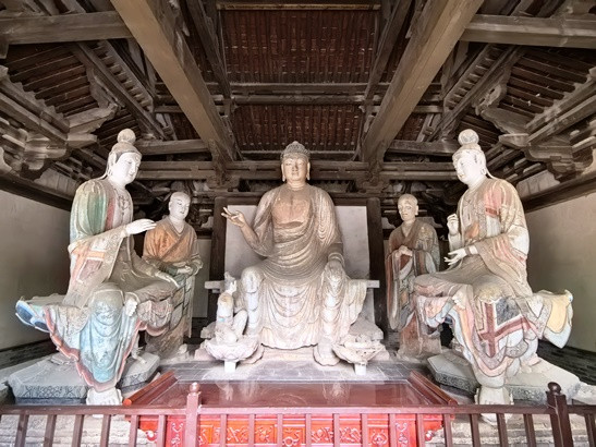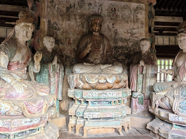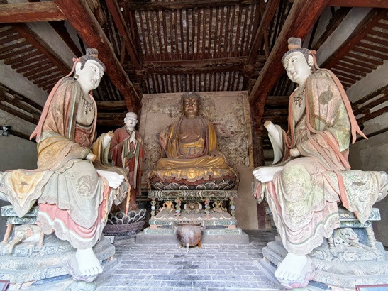 殿内宽大的佛坛上,保存着四尊宋代彩塑。释迦佛居中,手作拈花印,结跏趺坐在青莲台上。青莲台下砌成须弥座,束腰部分的四角塑着四个力士,作负重状,极为形象。文殊菩萨和普贤菩萨迎面而坐,一足自然垂下,显出淡然清净之美。普贤菩萨所坐莲台的须弥座束腰部塑出一个白象头,文殊菩萨所坐莲台的须弥座束腰部塑出一个狮子头;释迦佛右侧有阿南站像一尊。整组塑像表情自然,比例和谐。