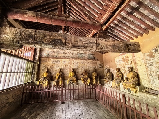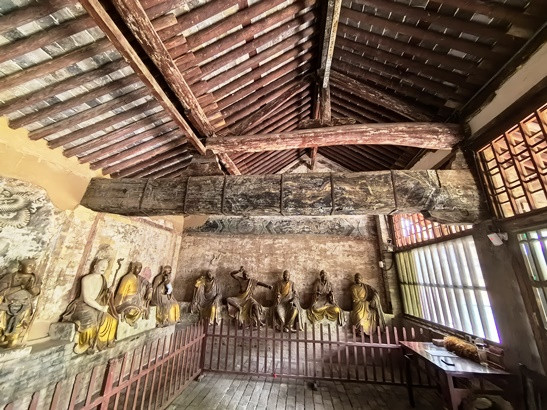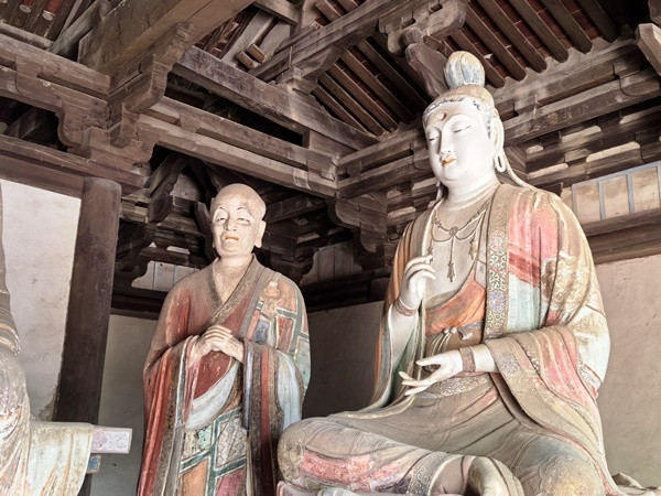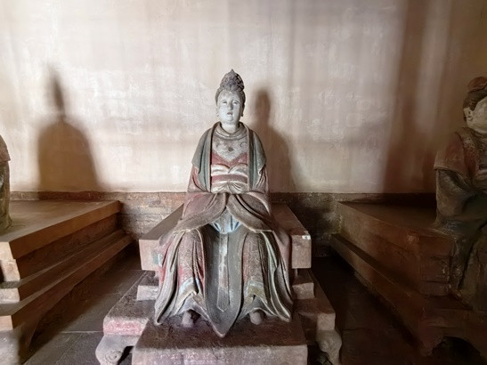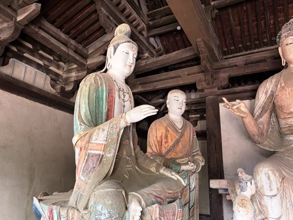 南殿是一座晚清时期重建的殿堂,现存12尊彩塑,佛坛上正面这5尊塑像是宋代原作,当中为释迦佛,结跏趺坐于莲台上,两侧为文殊、普贤二菩萨和阿难、迦叶二弟子。与正殿中的唐塑相比,这5尊宋塑更加注重写实,生动传神,具有浓厚的生活气息。其余则为明清时期的作品。南殿没有开放,可以隔着门窗观看。菩萨抱腿而坐的形象很生动、优雅。山西的古建允许游客拍照,很开放的理念。