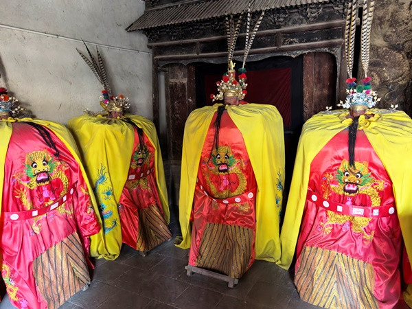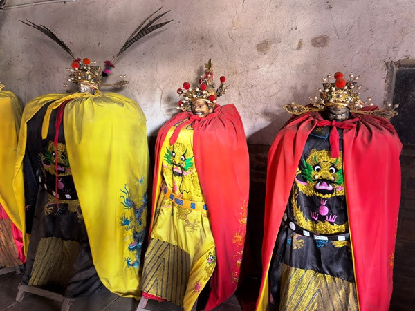 成汤殿两厢放置的阁楼式轿子,估计是每年过年闹社火时,抬出去巡游的物件。殿里还放置着很多乡村用于闹社火装扮的服饰和面具。