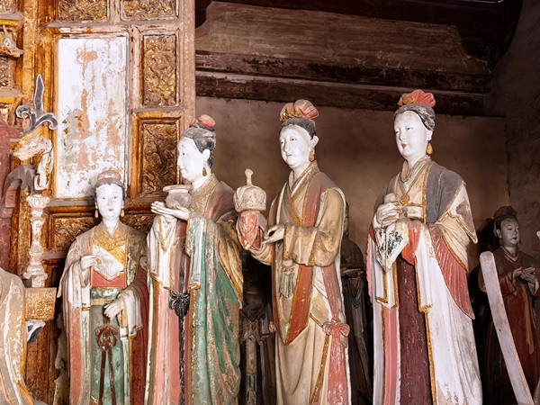 玉皇殿两厢的侍女。侍女塑像已脱离了宗教神话的规范与拘囿,成为中国封建社会宫廷生活的真实写照。根据所塑姿势神态和手持器物,可知她们是为玉皇大帝日常生活服务的侍者,均为年轻少妇。头饰、发髻纹理简括洗练,自然贴体,面相俊秀俏丽,风度温柔典雅,表情虔诚恭顺。其形姿和所塑手法,可以和晋祠圣母殿的宋代侍女彩塑相媲美。