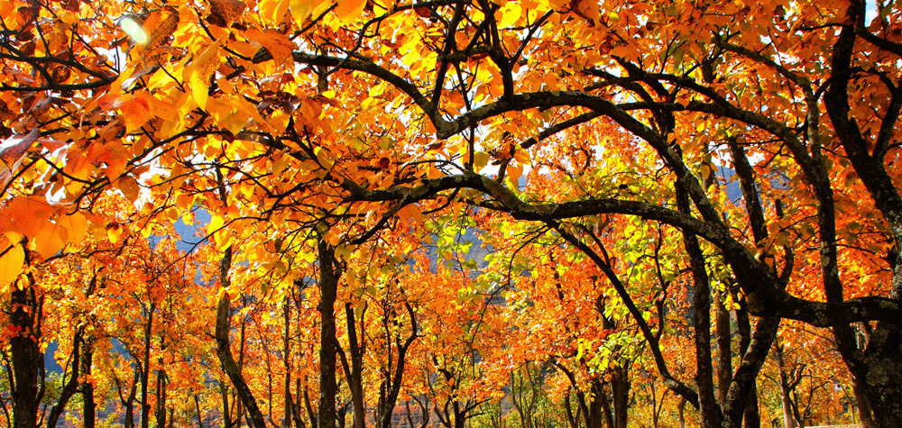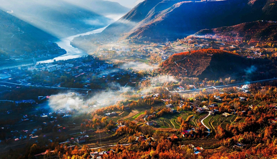 连绵百余里的红叶点缀着金川大地,就宛如山火燃烧着铺向远方的赤红画卷。秋天是金川色彩绚丽的季节。