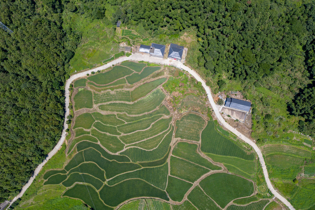 当我看到无人机镜头下的港背村,我更被这份与生俱来的自然之美所震撼,不得不承认,任何华丽的语言都比不上大自然的神来之笔,有时只是轻描淡写的一笔,就足以让人一眼万年。无人机下,港背村渺小却难以忽视,大片的草地相互依偎,一条蜿蜒曲折的公路将绿色划开,宛若银色玉带,将原本单调的画面打破,碰撞出独具一格的美感。