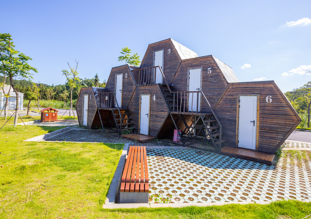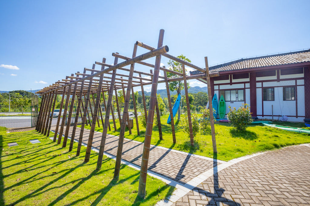 营地面积很大,初见时便被其淳朴的气息所吸引,蓝天白云下,一座古朴的四角建筑遗世而独立,红白相间,尽显古色古香,四周绿草如茵,一旁的雕塑造型独特,宛若小时候搭建的积木房子,让人倍感亲切,瞬间卸下了所有防备。