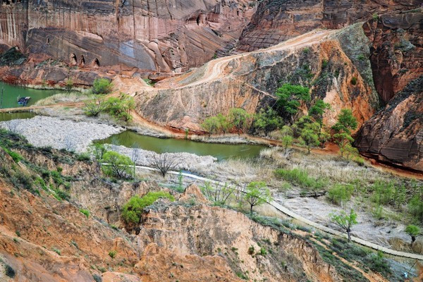 在赤霞丹霞景区,一边是赤色的陡峭的大山,一边是湿地和山坡。蛙鸣声此起彼伏,一些树木没有一片绿叶,挣扎着迎接春天,数百米长的峡谷里安静极了。