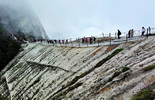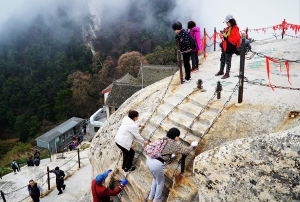 4月20日 30年前,我与浙江的几位朋友上过华山。那天半夜一点钟,每人带着一只手电筒登山。乘着夜色,天不怕,地不怕,连续翻过了几个用铁链子组成的几乎垂直的梯子,花了11个小时,从北峰玩到西峰。由于要赶回西安开会,我们没有攀登最高峰——南峰。这次上华山,当然要了却这个遗憾。