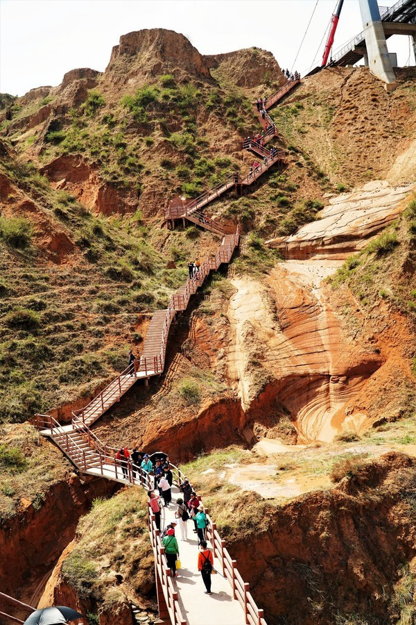 下午游览中国的羚羊角。2017年底,据说是一位北京的摄影大家,在延安意外地发现,这里的丹霞地貌可与美国的羚羊角媲美。他发出的照片轰动摄影界。由于这个地理发现在延安的雨岔村,当时,大家都叫她为:雨岔大峡谷。因为政府所在地是甘泉县,所以,目前所有的地方标志是:甘泉大峡谷。而旅游界把她放在世界地理的位置上,称她为:中国的羚羊角。不同的人群站在不同的角度,但是有一点是肯定的,这里很美,是世界级别的旅游景点。