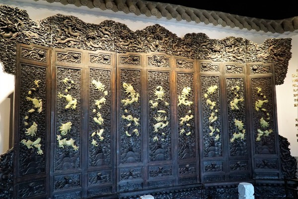 ▲清代花梨木的屏风,是乔家大院的珍宝之一。屏风上雕刻有大小81条相互呼应的龙。