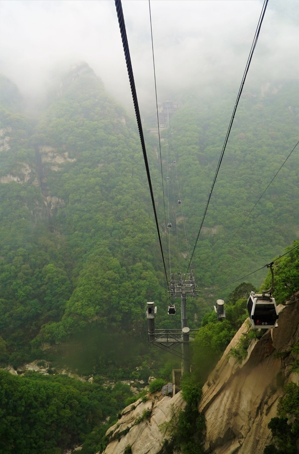 ▲去华山西峰的索道,沿着山体大幅度的起落,有点惊心哦。一些女士闭上眼睛,觉得心脏压力有点大了