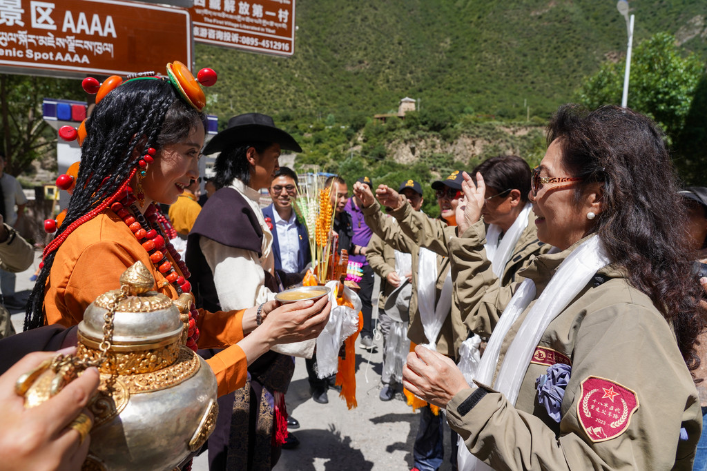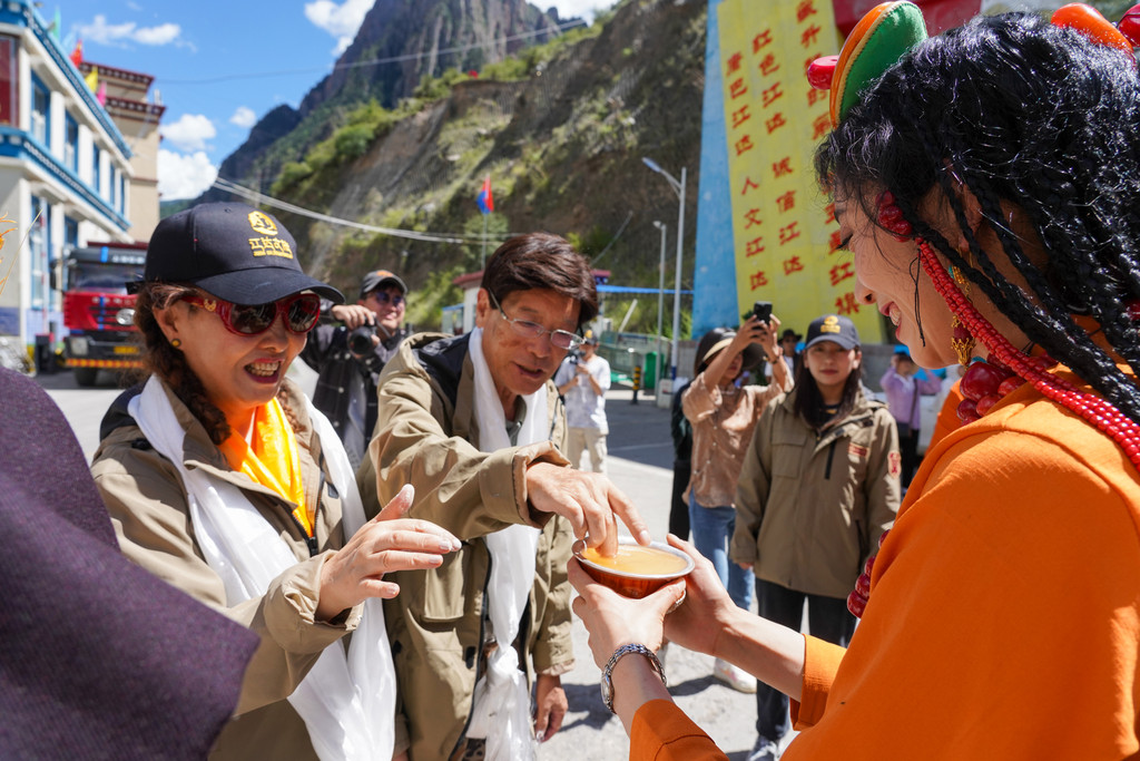 中午我们到达了此行的第一个目的地,西藏解放第一村——江达县岗托镇岗托村,这次非常有幸可以跟随十八军的后代们一起重走这段非常有意义的入藏之路,跨过金沙江,从四川进入到西藏,受到了岗托村当地居民的热情欢迎。