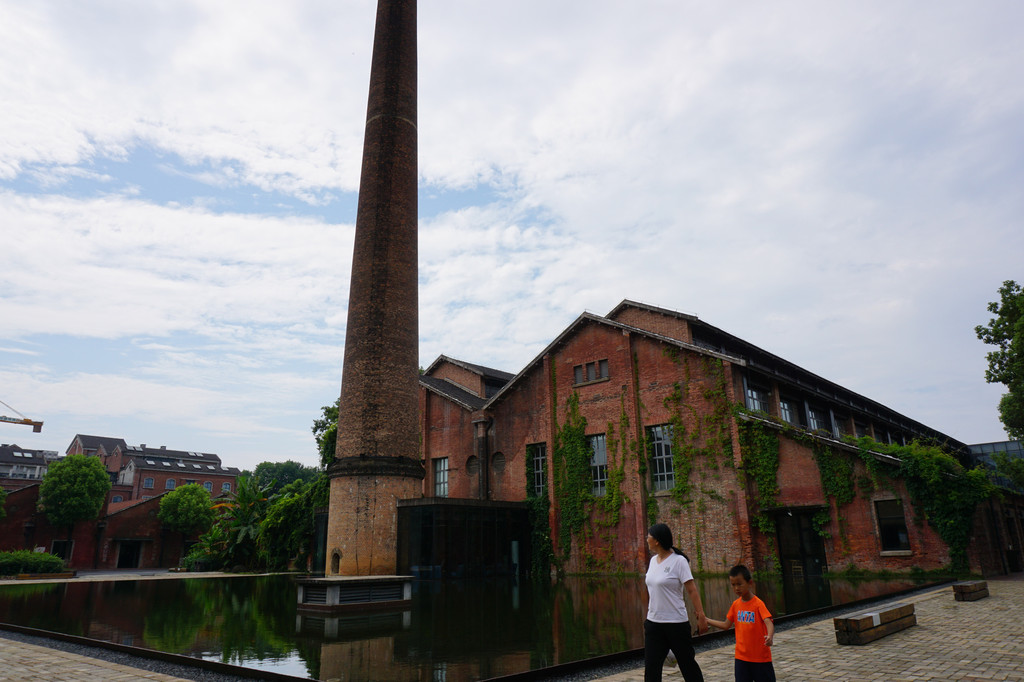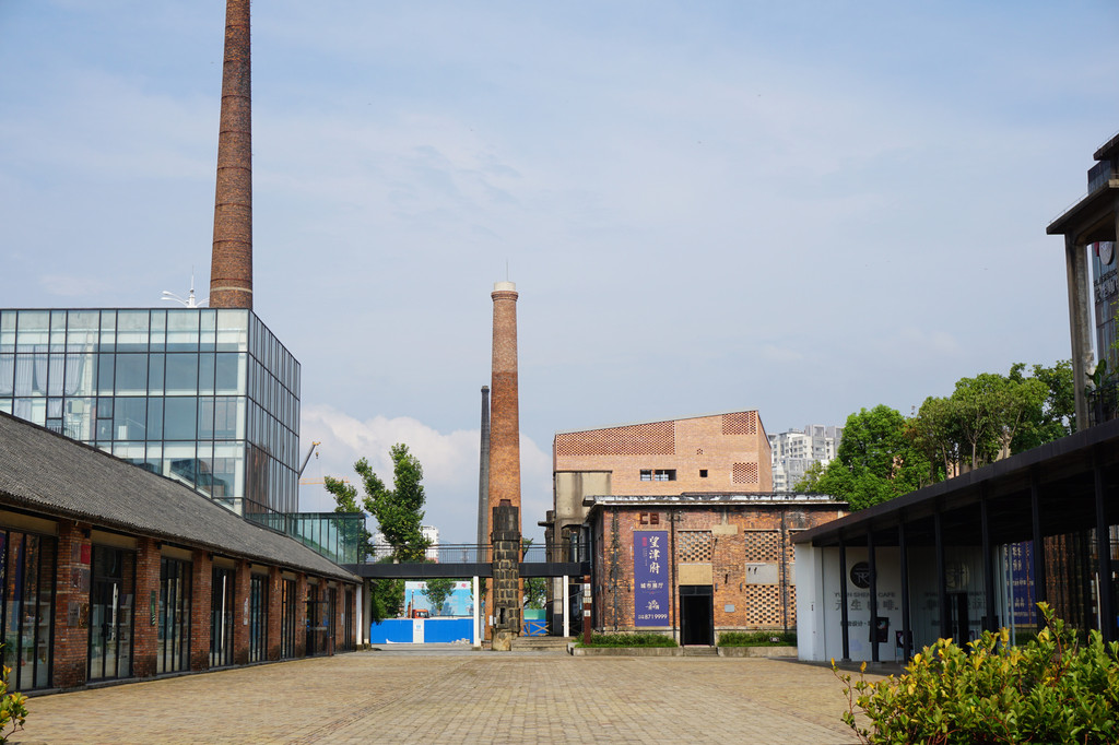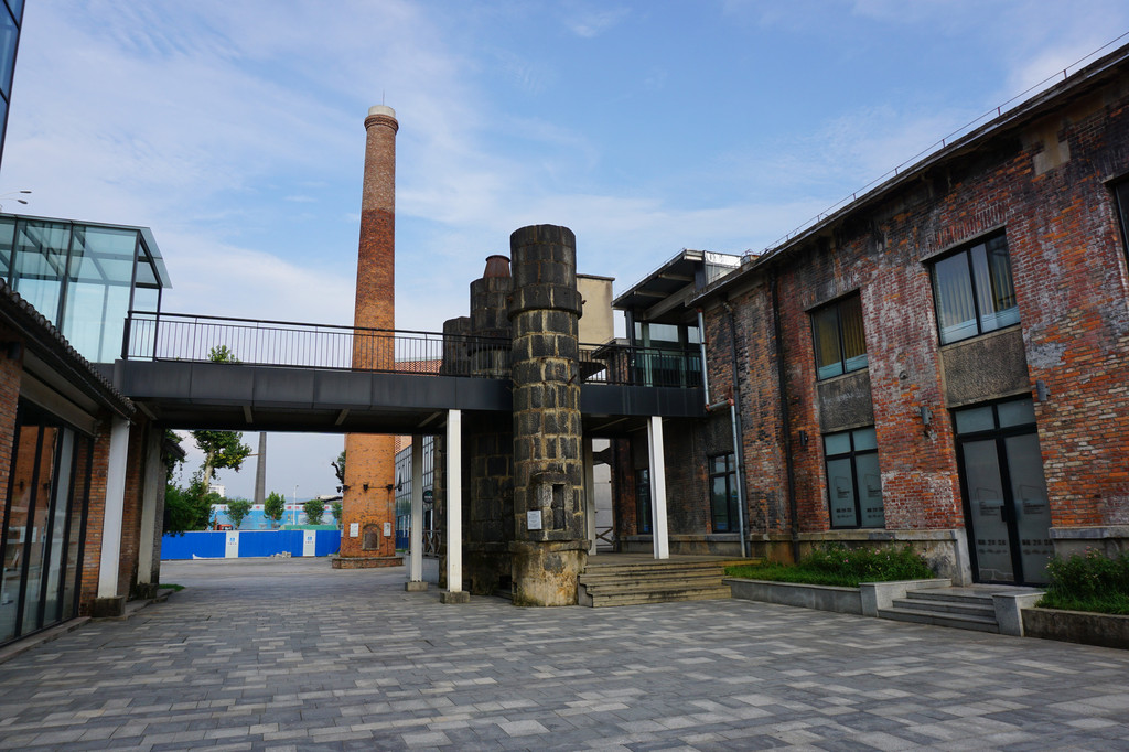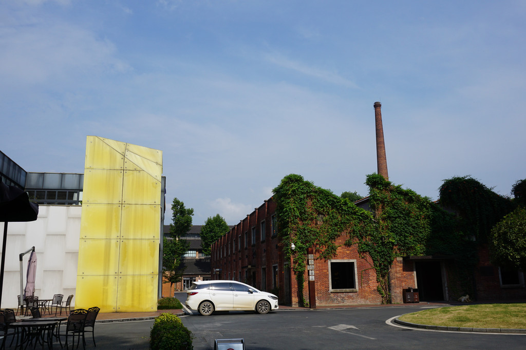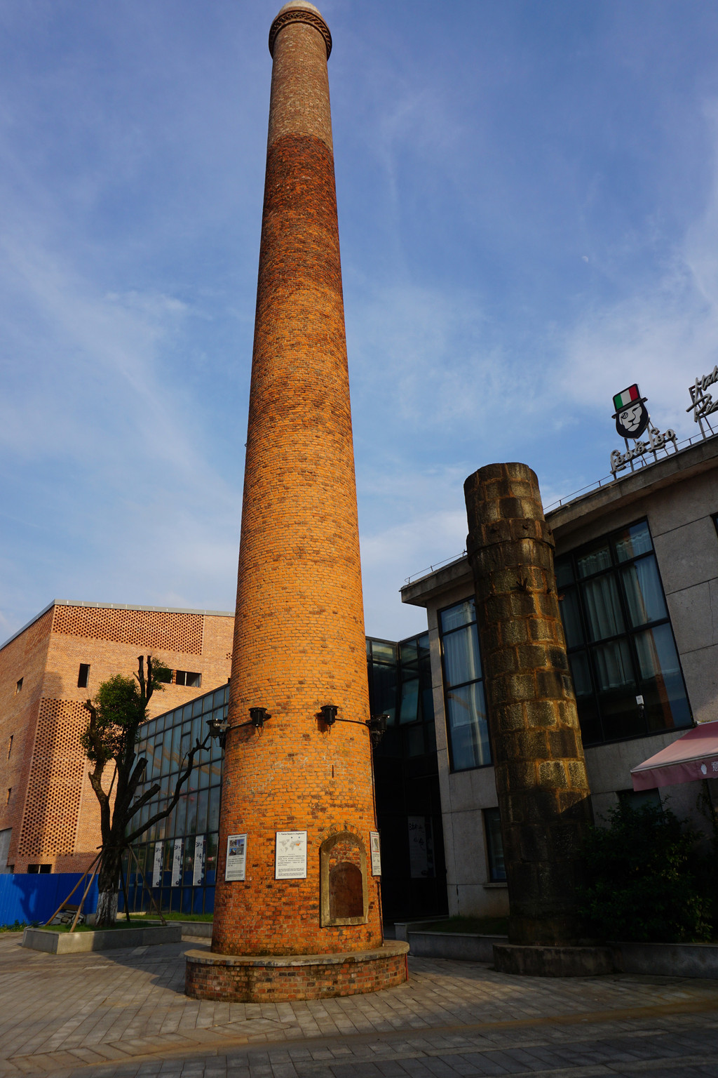 一场美丽的视觉盛宴后我回到户外。蓝蓝的天,高大碧绿的梧桐,高耸的烟囱。如果说建筑是旧工厂的主体,那么这些挺拔有力的梧桐树就是与其自然配比的景观。这些都自然承载着不少人情往事。那些幼年的梧桐现如今它郁郁葱葱,等待着曾经青春年少的你再次回首,如约而至。这种对于建筑与环境遗存的共同保留才是对工业遗产最大的保护。绿意包围的大烟囱将这片本是高大的厂房建筑活生生的变得低矮了,这些老式烟囱实在是显眼。所有的这些工业时代的遗迹被保留下来,融入到经过改造的旧式建筑和新建筑之中,见证着陶瓷梦的传承。