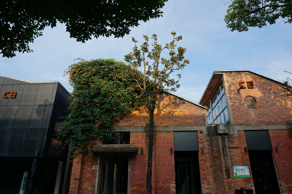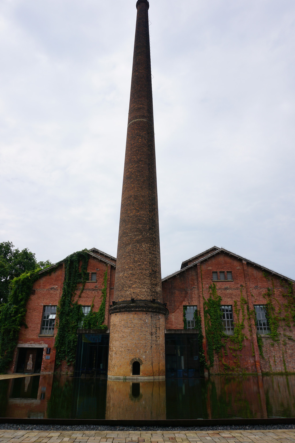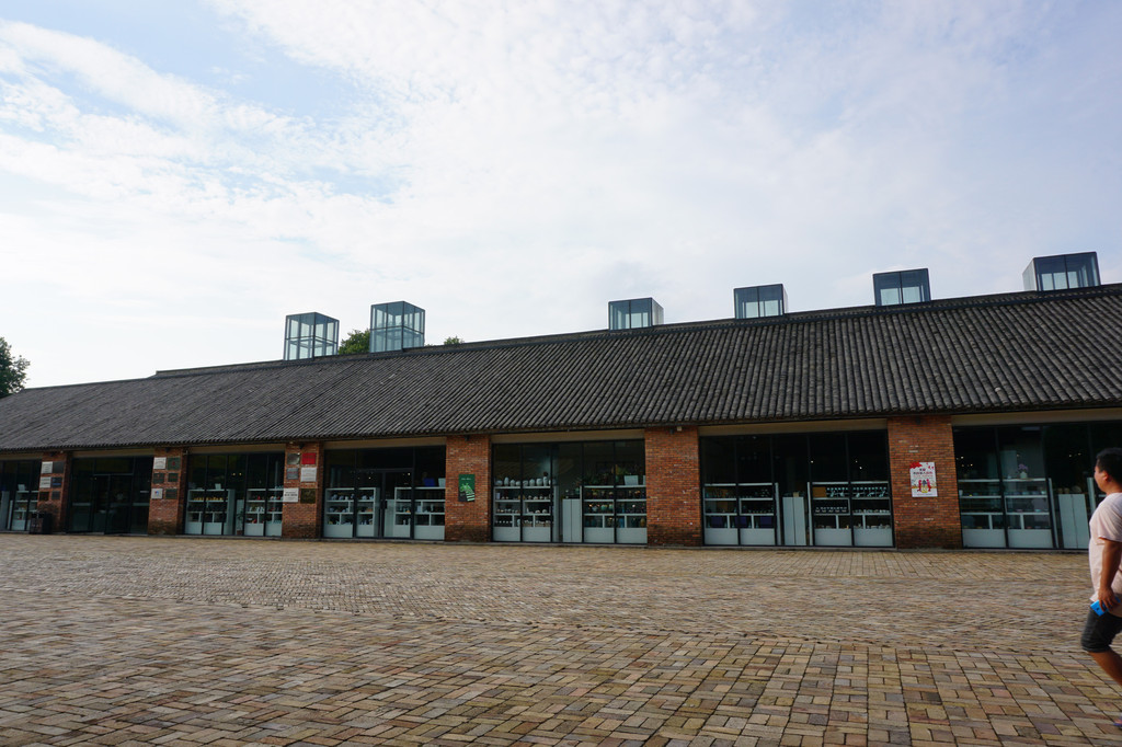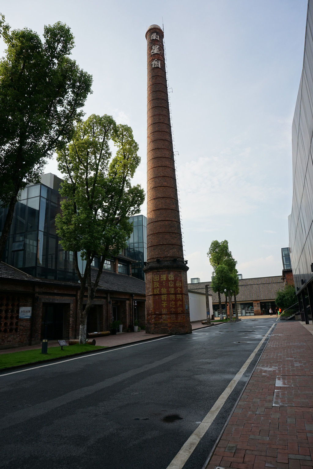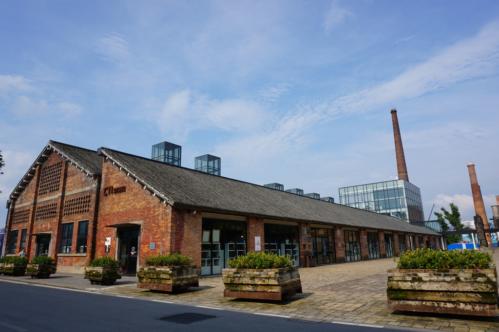 一场美丽的视觉盛宴后我回到户外。蓝蓝的天,高大碧绿的梧桐,高耸的烟囱。如果说建筑是旧工厂的主体,那么这些挺拔有力的梧桐树就是与其自然配比的景观。这些都自然承载着不少人情往事。那些幼年的梧桐现如今它郁郁葱葱,等待着曾经青春年少的你再次回首,如约而至。这种对于建筑与环境遗存的共同保留才是对工业遗产最大的保护。绿意包围的大烟囱将这片本是高大的厂房建筑活生生的变得低矮了,这些老式烟囱实在是显眼。所有的这些工业时代的遗迹被保留下来,融入到经过改造的旧式建筑和新建筑之中,见证着陶瓷梦的传承。