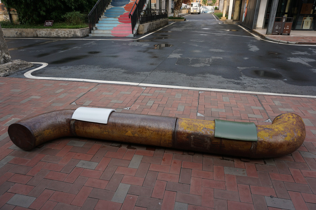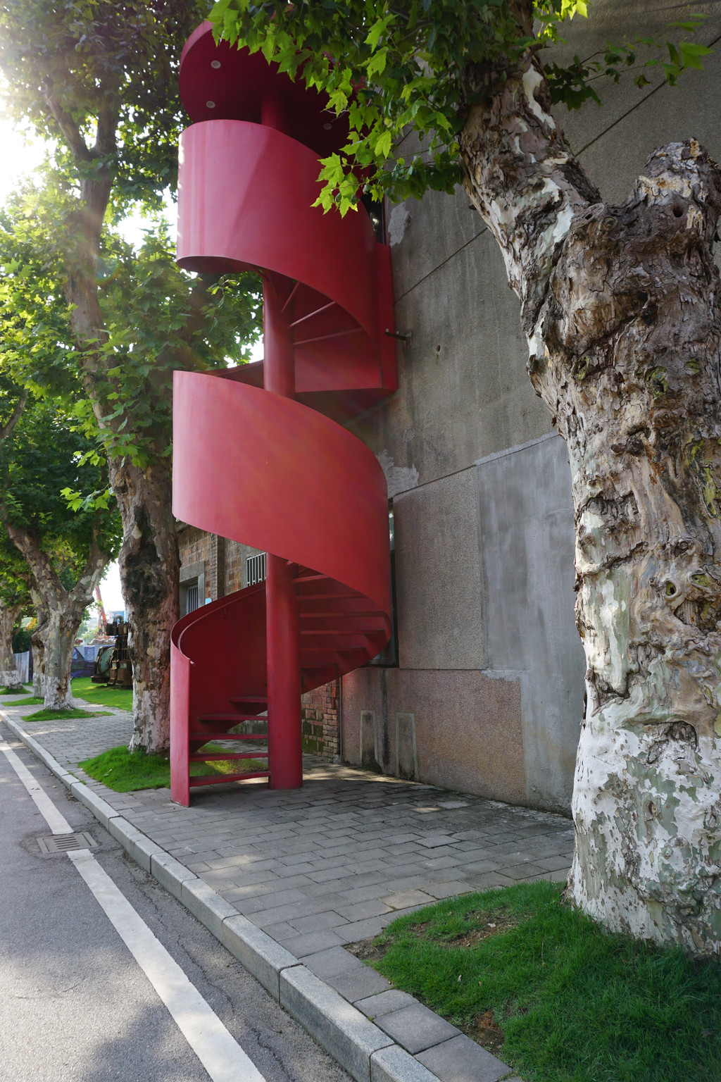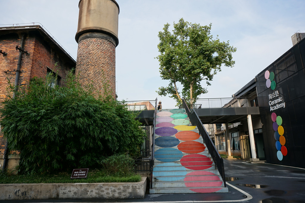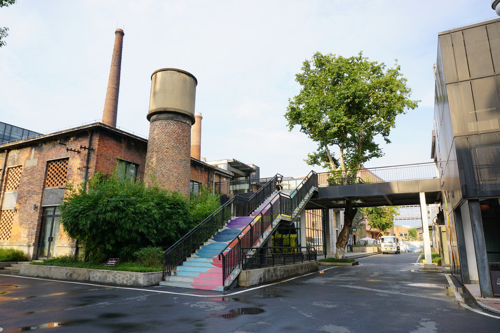 在坚硬高大的水塔边,工业的钢制楼梯加上彩色的绘画,还有那棵梧桐树,随便一定格都是美美哒。陶溪川就是这样,或刻意,或无意间把美学放在街道上,把艺术放在街道上。