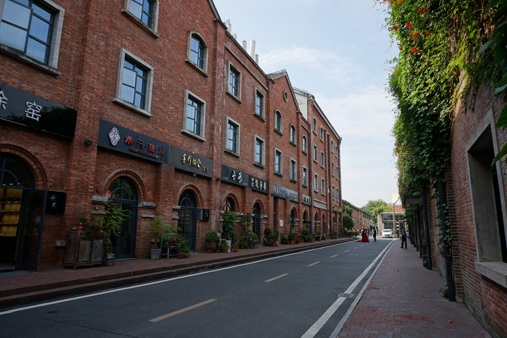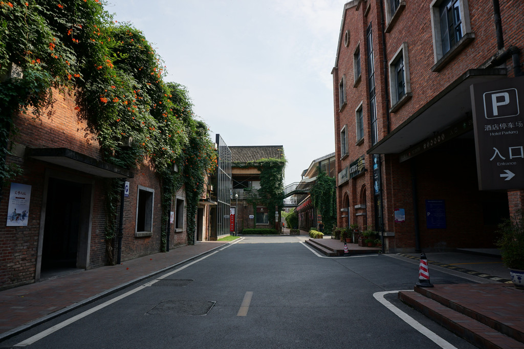 从庭院中出来沿着街道往西行走。两侧都是披着爬山虎的红砖墙的厂房。灰瓦青墙,婆娑的树影在晴空下舞弄凉意。在这里没有车流人群的喧闹嘈杂。虽然是八月,但习习微风掠过暑意全无。