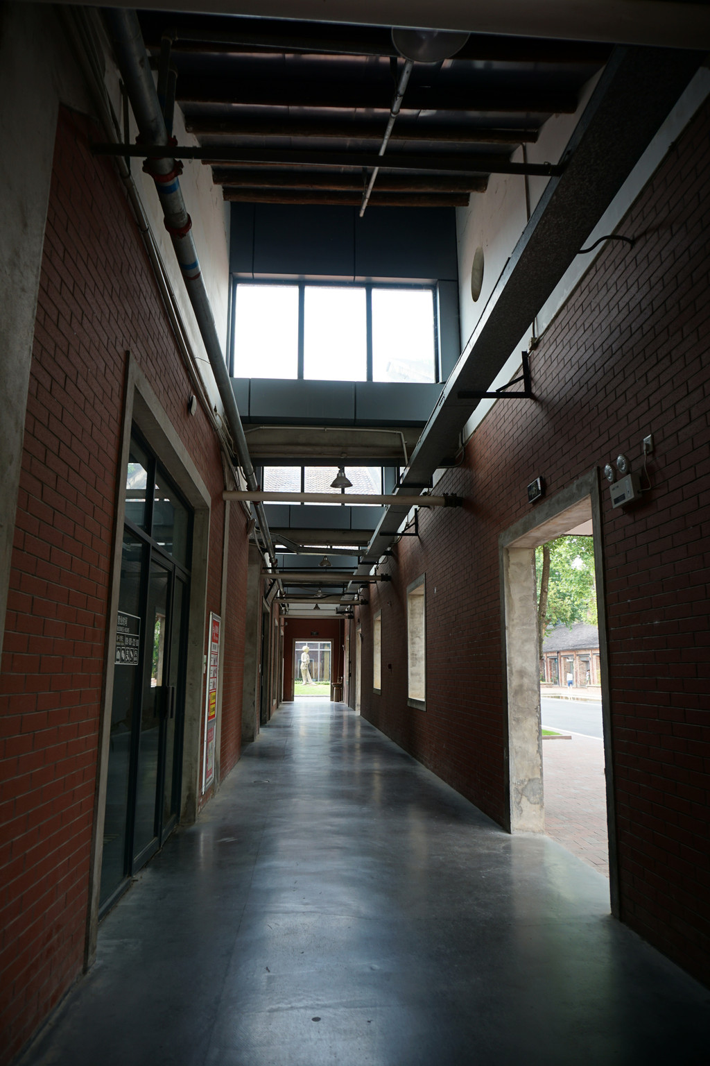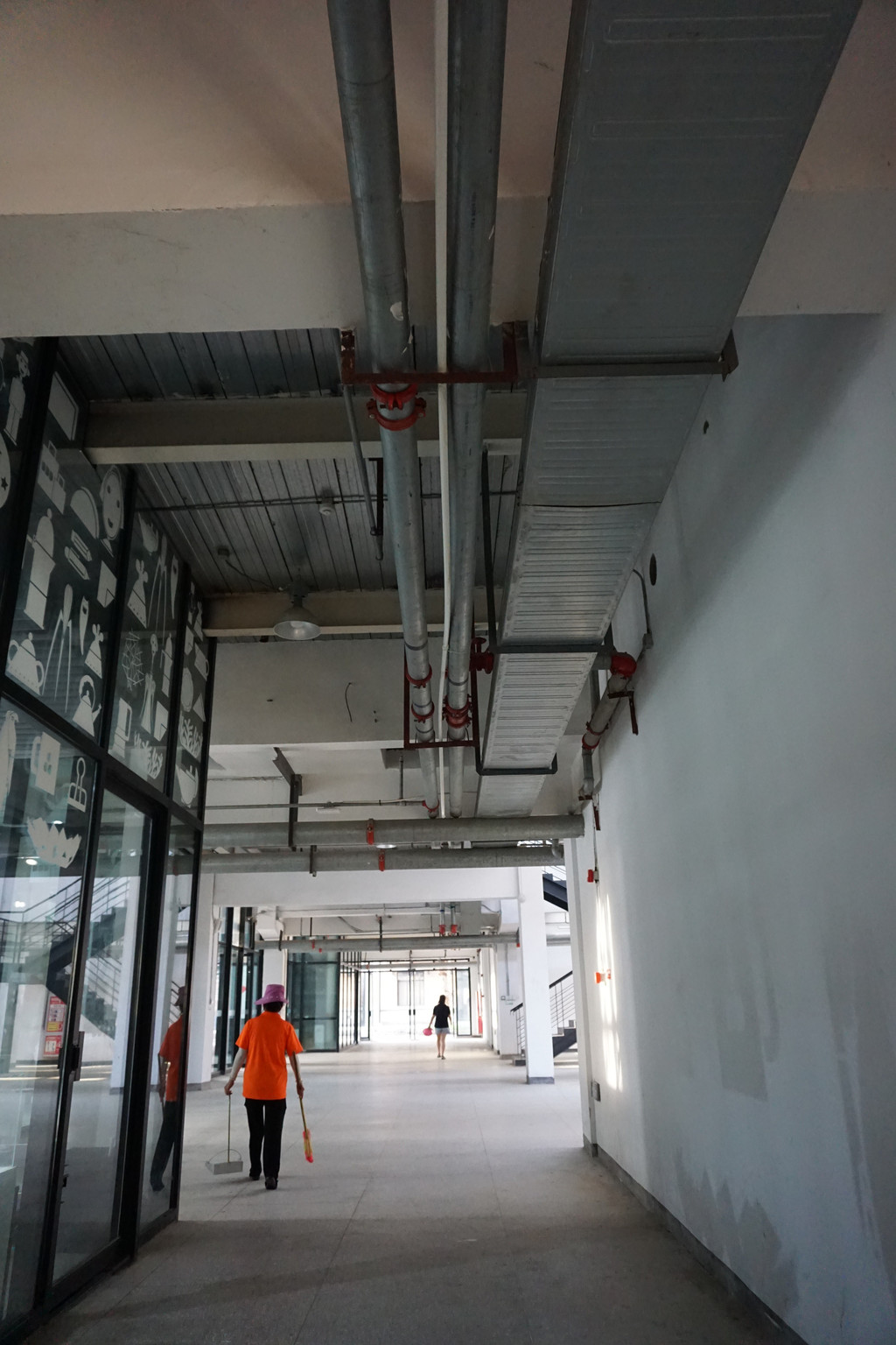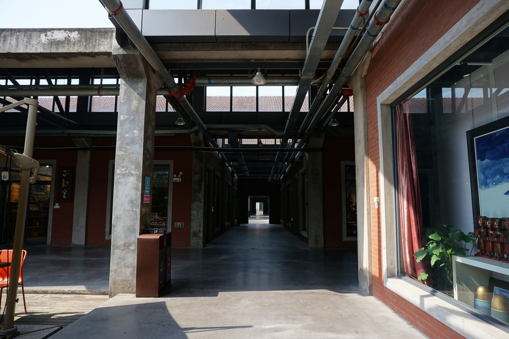 两栋厂房间宽敞的间距。北侧的现在是陶溪川的邑空间,南侧的是景德镇工业遗产博物馆,远远的连接南北的是高低错落的烟囱,高低错落的厂房。厂房的结构,规模变化不大,但原有的功用被新的时尚元素取代。