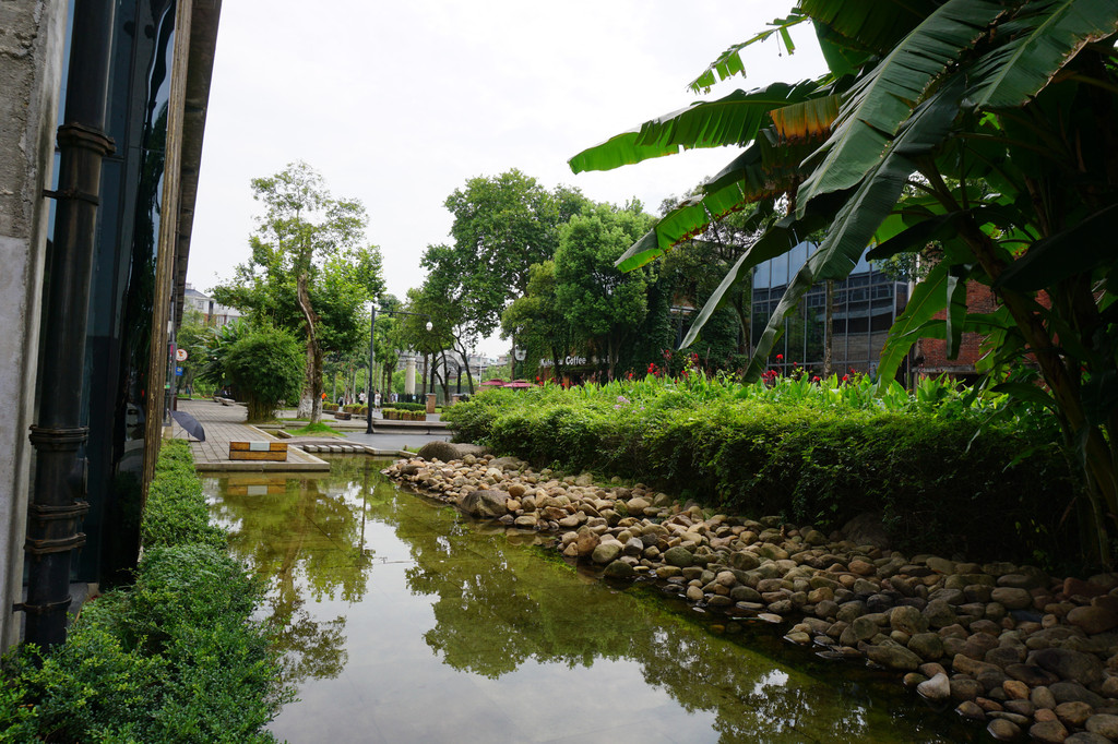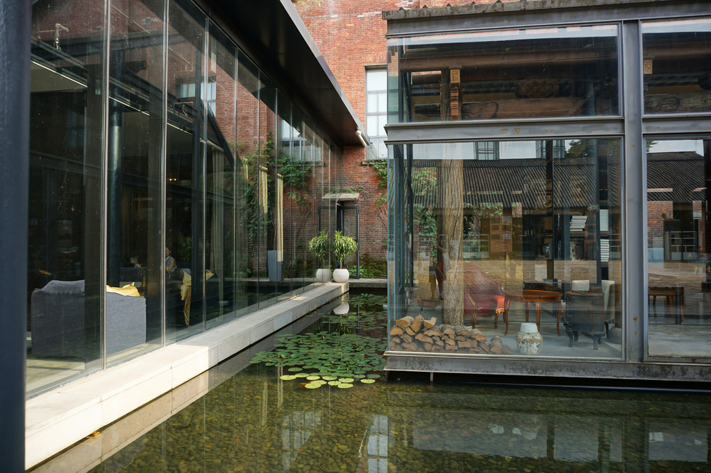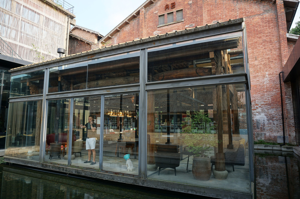 高大的建筑被碧绿明亮的流水环绕。清凌凌的碧水映照着周围一切的倒影。好一幅江南美景的画面。所有的园林细节出现在景德镇陶溪川工业遗产的旧工厂当中,每一处的连接都别致巧妙,每一个片段都恰到好处。