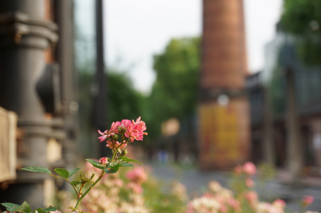 烟囱,墙壁上遗留的标语, 仿佛要带着人们回到那个煤烟鼎沸,工人熙熙攘攘的时代。