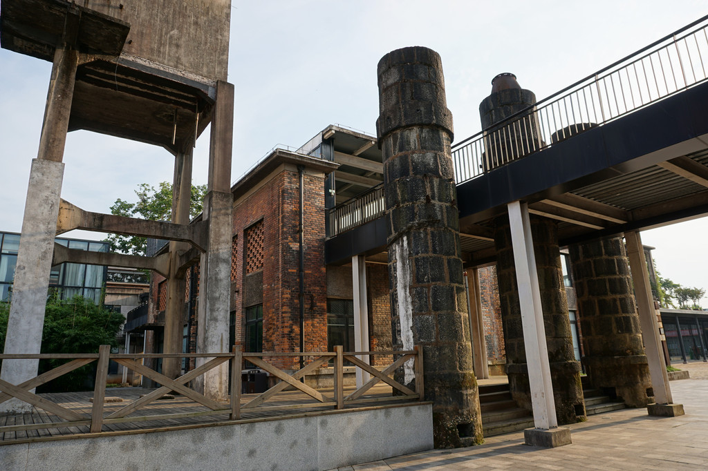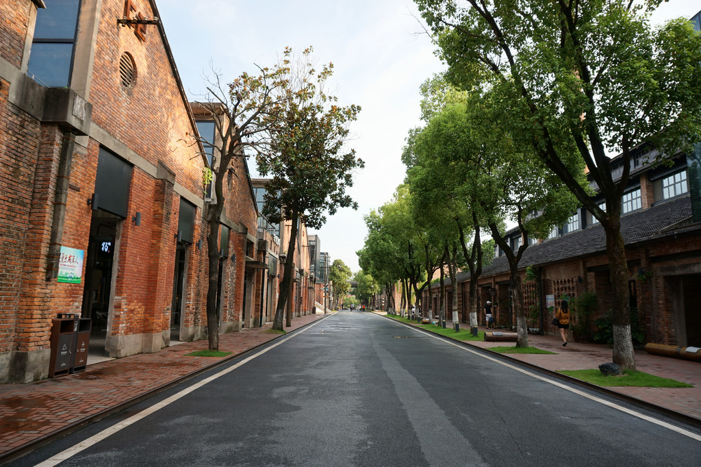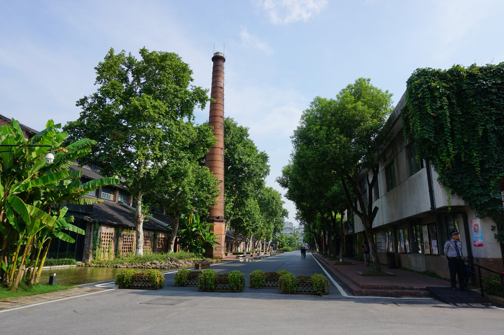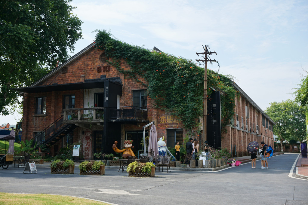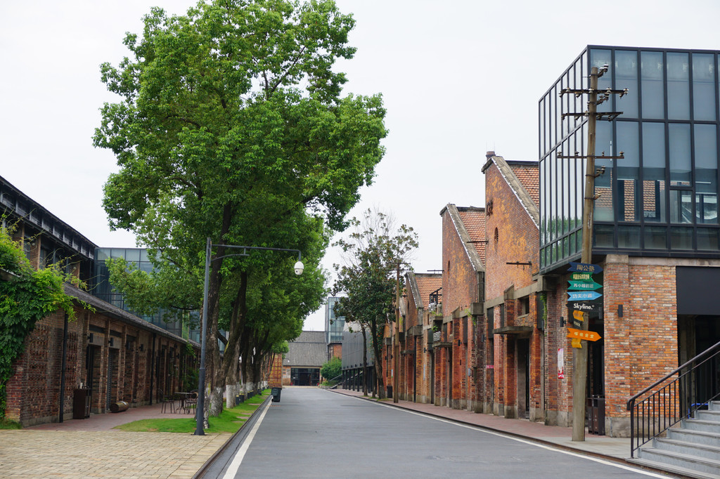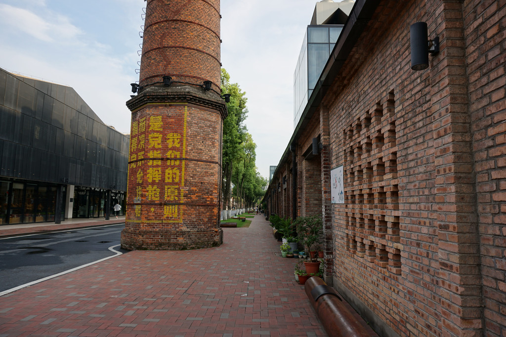 离开广场又来到纵贯南北的街区街道上。两侧虽都是厂房,但细看厂房的造型和风格还不同。光从建筑结构看都是极有艺术感的。独具特色的锯齿型、人字型厂房,高耸的烟囱、水塔,不同时代的老窑炉,各种工业化管道,以及墙上的老标语、口号、青苔等,保存原汁原味,成为陶溪川一道独特而靓丽的风景。