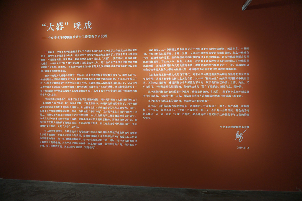 此时的美术馆正在举办 “器像万千——中央美术学院雕塑系第六工作室教学研究展”。展览免费参观。前言“大器晚成”介绍了这个展览:本次展览是“百年校庆”雕塑系导师工作室教学梳理的第五个展览,展览呈现了六工作室十年来的教学思想和理念,是教学成果的一次总结,内容丰富“器像万千”。